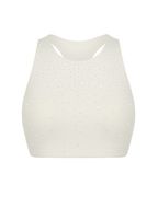 Коллекция названа в честь полярного света — и именно так ткань работает в движении: гладкая, слегка мерцающая, с эффектом внутреннего свечения. Стразы на других изделиях капсулы дополняют общее сияние, превращая каждый шаг в танец света. В составе — волокно Lycra® и четырёхсторонняя растяжка: материал тянется до 7 раз и сохраняет форму даже после нагрузок. Дополнительно: антибактериальные свойства, влагоотведение и УФ-защита.