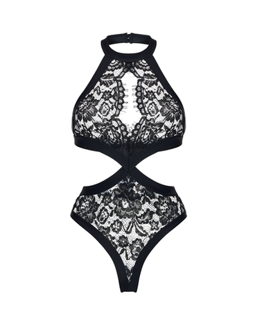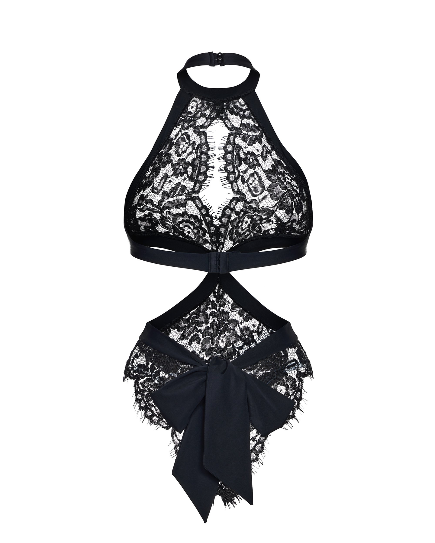 Соблазнительное боди из прозрачного кружева подчеркивает силуэт и играет на контрасте закрытого верха и открытой линии талии. Глубокие вырезы создают акцент на изгибах, а высокий воротник добавляет пикантной элегантности. Атласный бант на пояснице завершает образ, превращая его в по-настоящему эффектный.