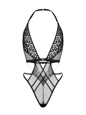 Боди Awena — это эффектный дизайн, подчёркнутый точной архитектурой линий. Верх выполнен из вышитого полотна с глубоким вырезом и мягкими треугольными чашечками, визуально вытягивающими силуэт. Нижняя часть украшена пересекающимися эластичными лентами, формирующими графичный рисунок, который подчёркивает талию и бёдра.