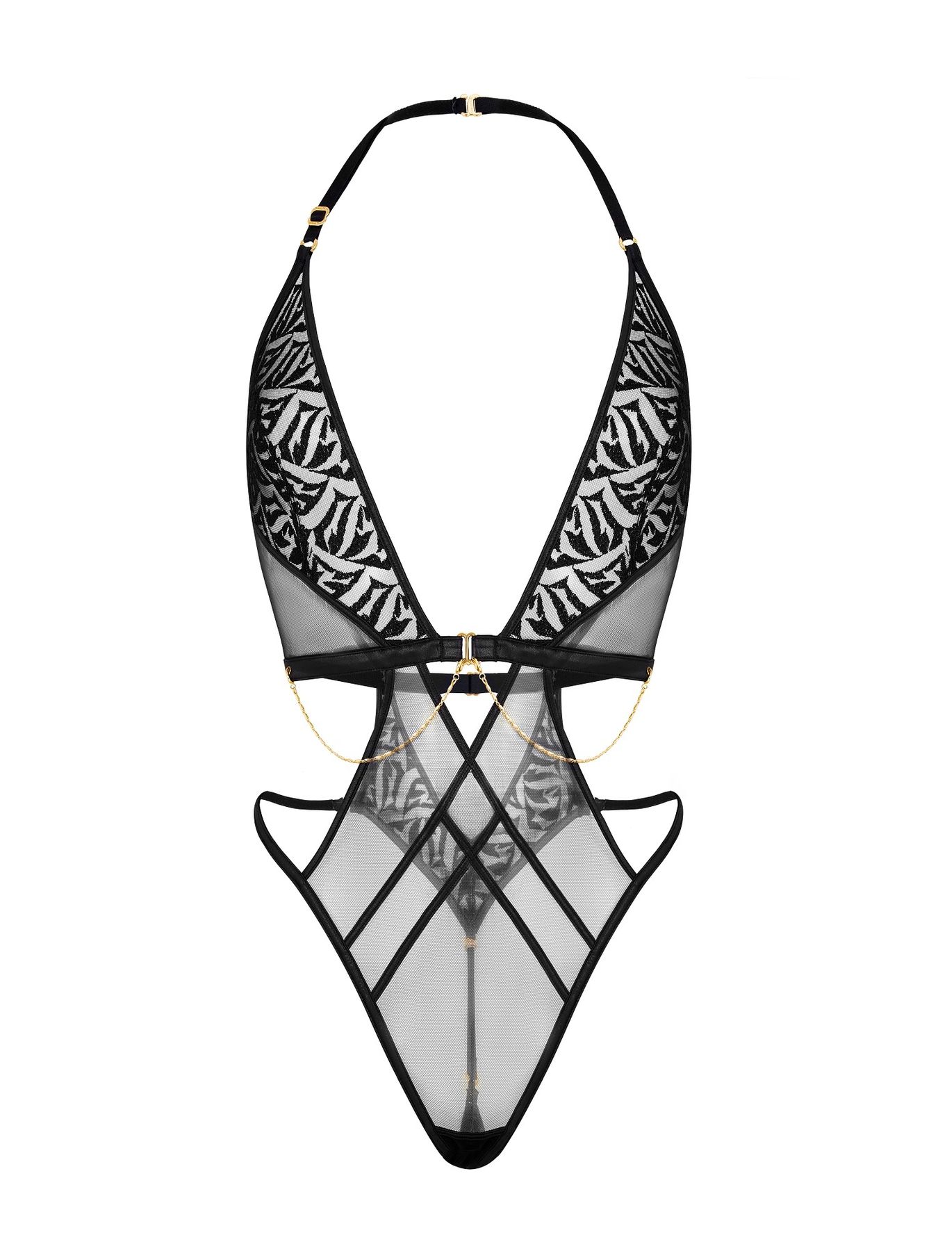 Полупрозрачные вставки создают баланс между откровенностью и утончённостью, а декоративные цепочки добавляют движению акценты. Регулируемые бретели и мягкие материалы обеспечивают комфортную посадку по фигуре. Боди можно носить как самостоятельный элемент или в сочетании с поясом Awena и чулками.