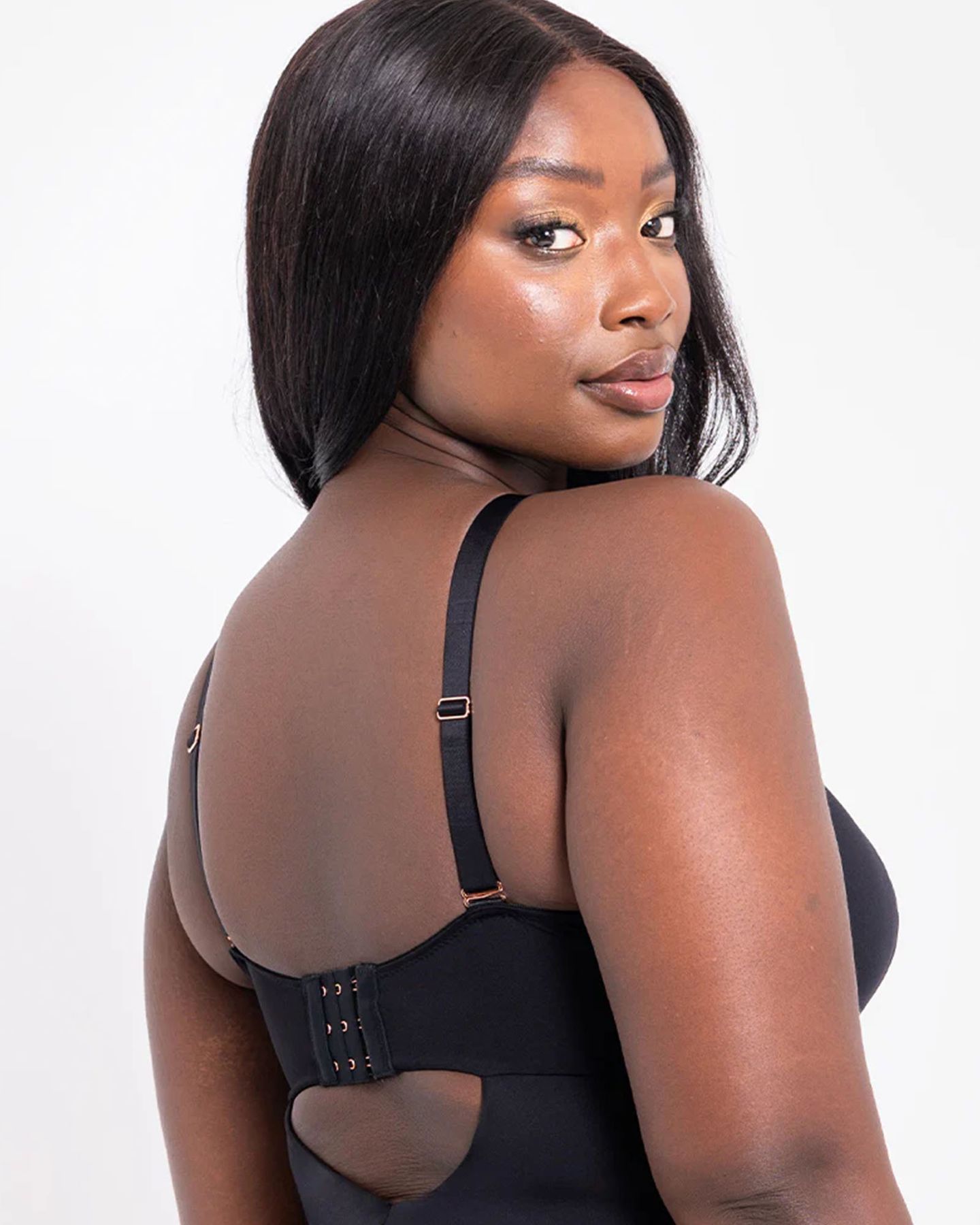 Глубокий вырез акцентирует линию декольте и плеч, добавляя сексуальной выразительности. Регулируемые многопозиционные бретели позволяют подстроить модель под себя, а изысканная фурнитура в оттенке розового золота завершает образ.