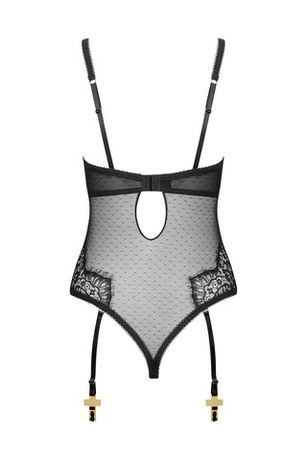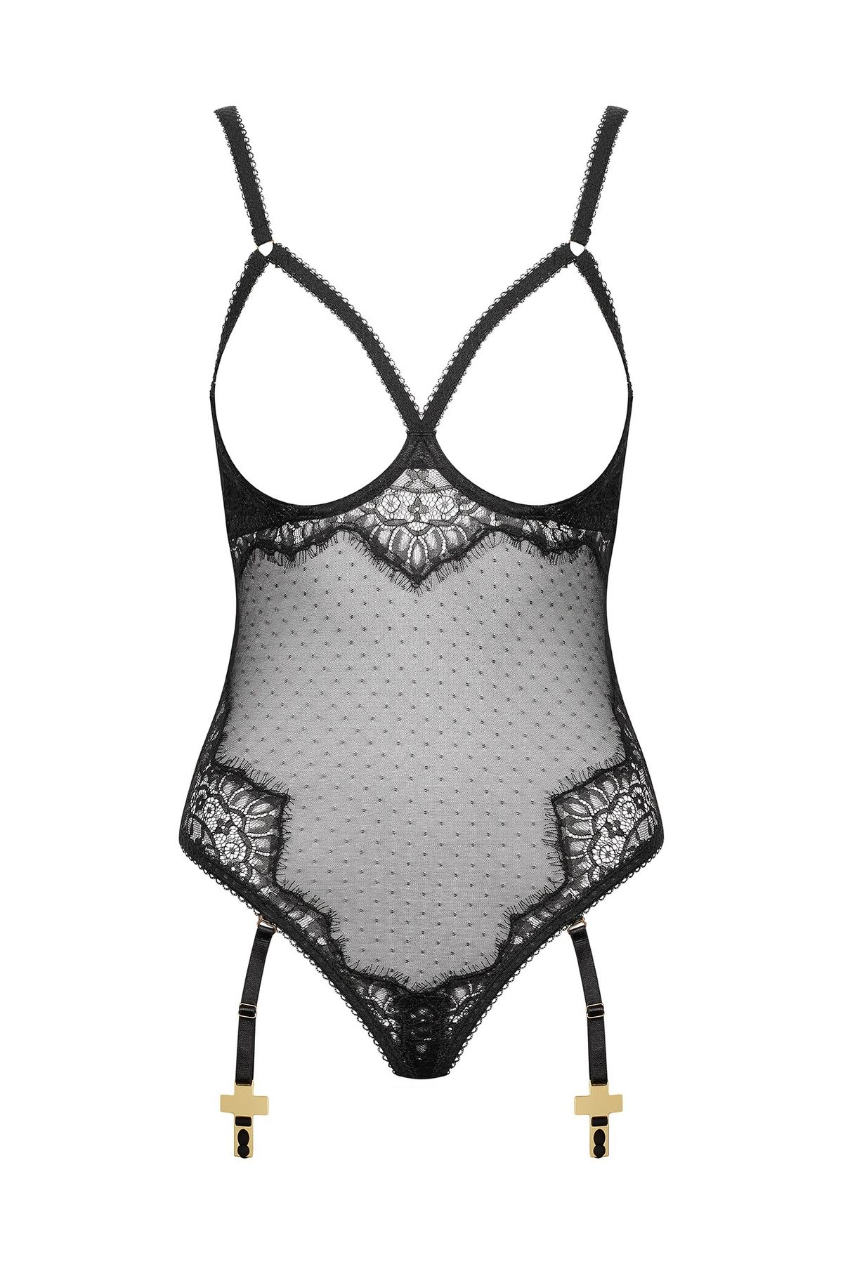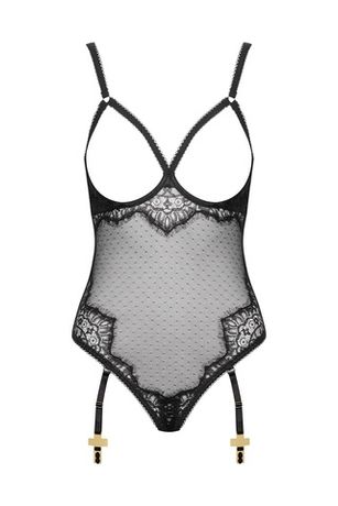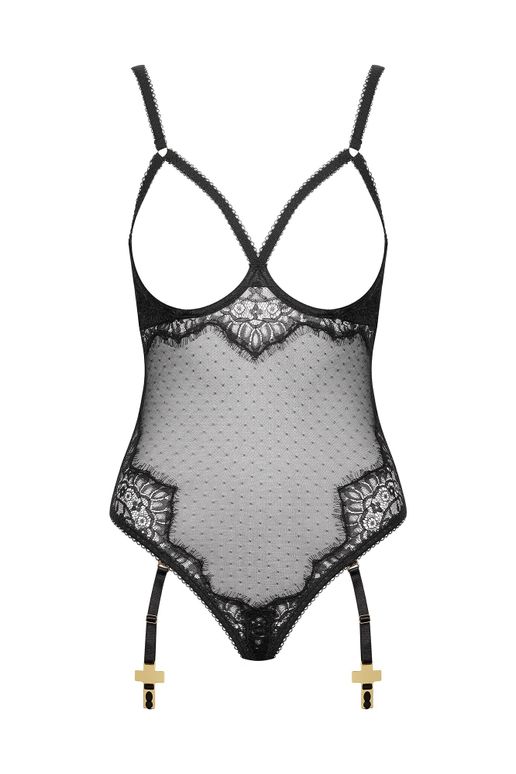 Боди-стринги с фигурным вырезом и открытой грудью сочетают готическое кружево с прозрачной вуалью тюли-плюмети. Застёжки на крючках в области промежности и на спинке обеспечивают точную и комфортную посадку.