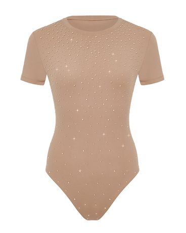 Боди Aurora — главная звезда коллекции, словно сотканная из света северного неба. Сотни сияющих страз превращают базовый крой в дизайнерский акцент: они мягко рассеиваются по телу, подчёркивая грудь, талию и бедра. Плотная посадка, круглый вырез и короткий рукав создают завершенный силуэт — актуальный и для спорта, и для выхода.