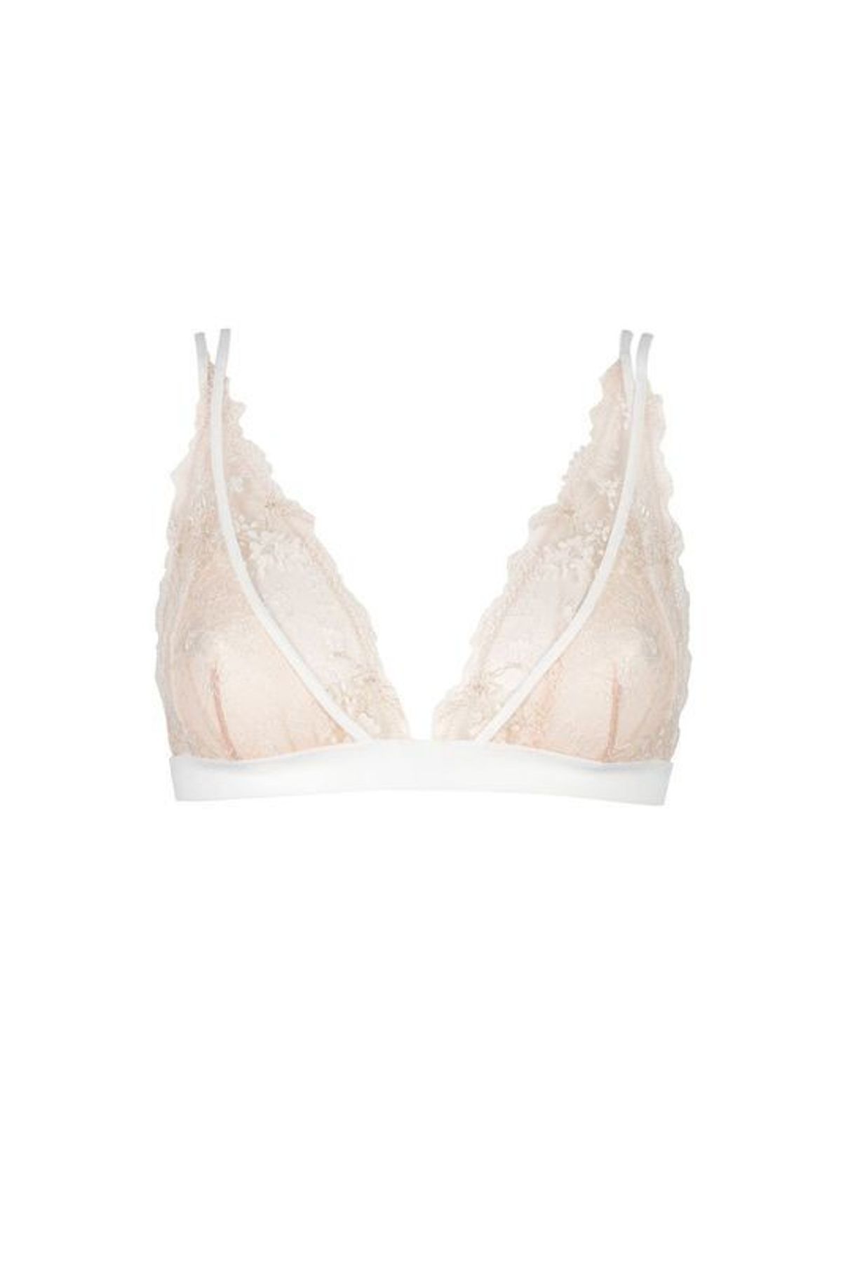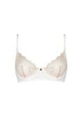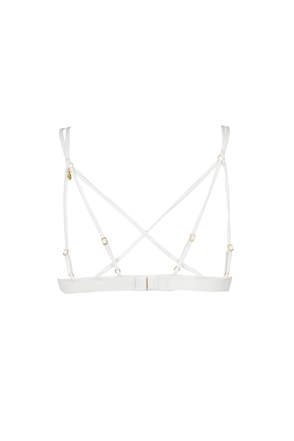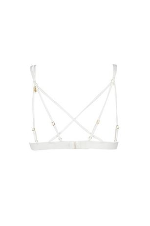 Бралетт из полупрозрачного кружева в белом цвете создаёт образ лёгкости и утончённости. Мягкие треугольные чашки подчёркивают естественную форму груди, а эластичный пояс обеспечивает комфортную посадку. Декоративные перекрестные ленты на спине и золотистая фурнитура придают модели современный акцент, делая её идеальной как для особых случаев, так и для повседневного настроения.