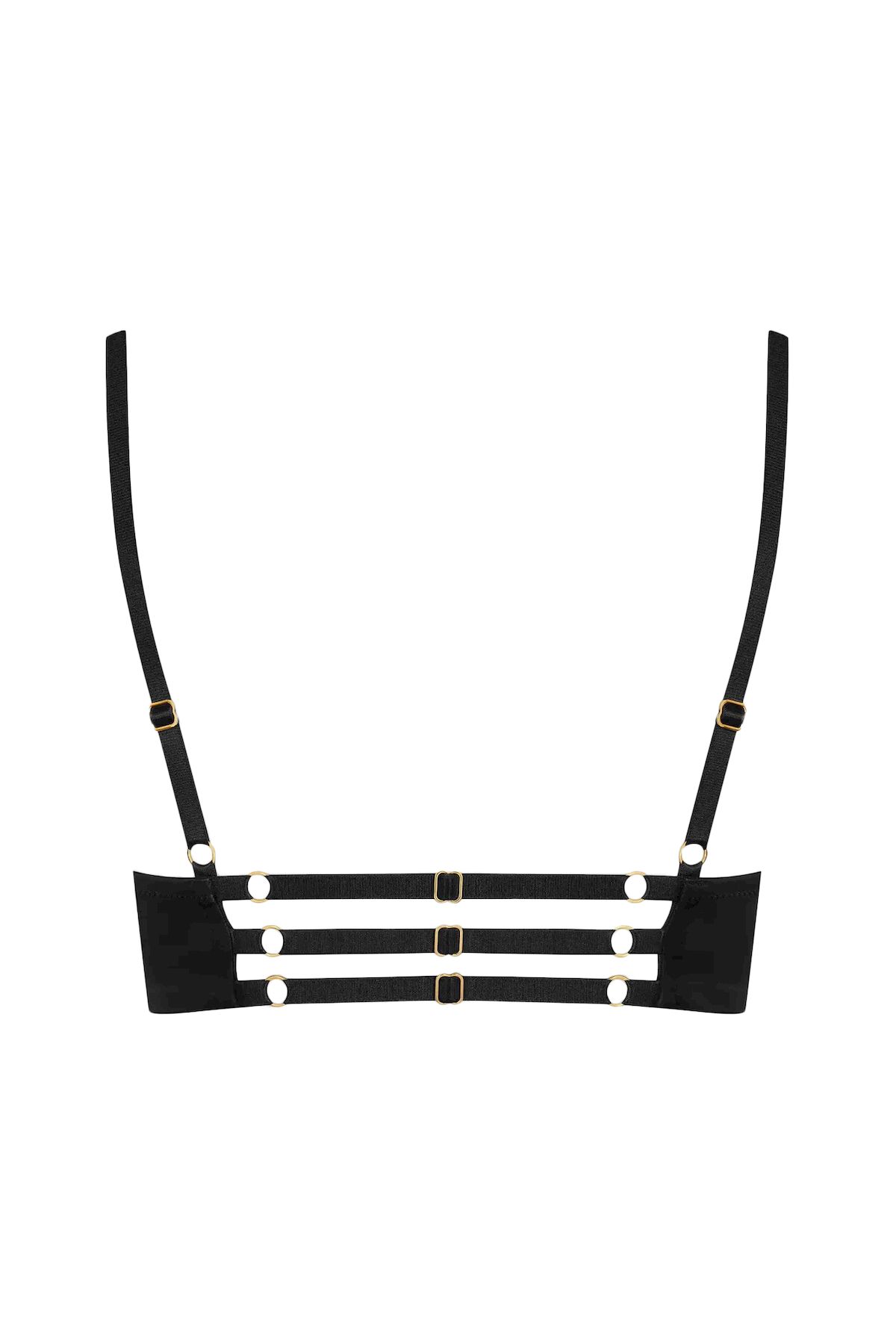 Минималистичный силуэт с фирменным золотым кольцом спереди и эффектной спинкой с тремя эластичными ремешками объединяет комфорт и провокацию. Регулируемые бретели обеспечивают идеальную посадку.
