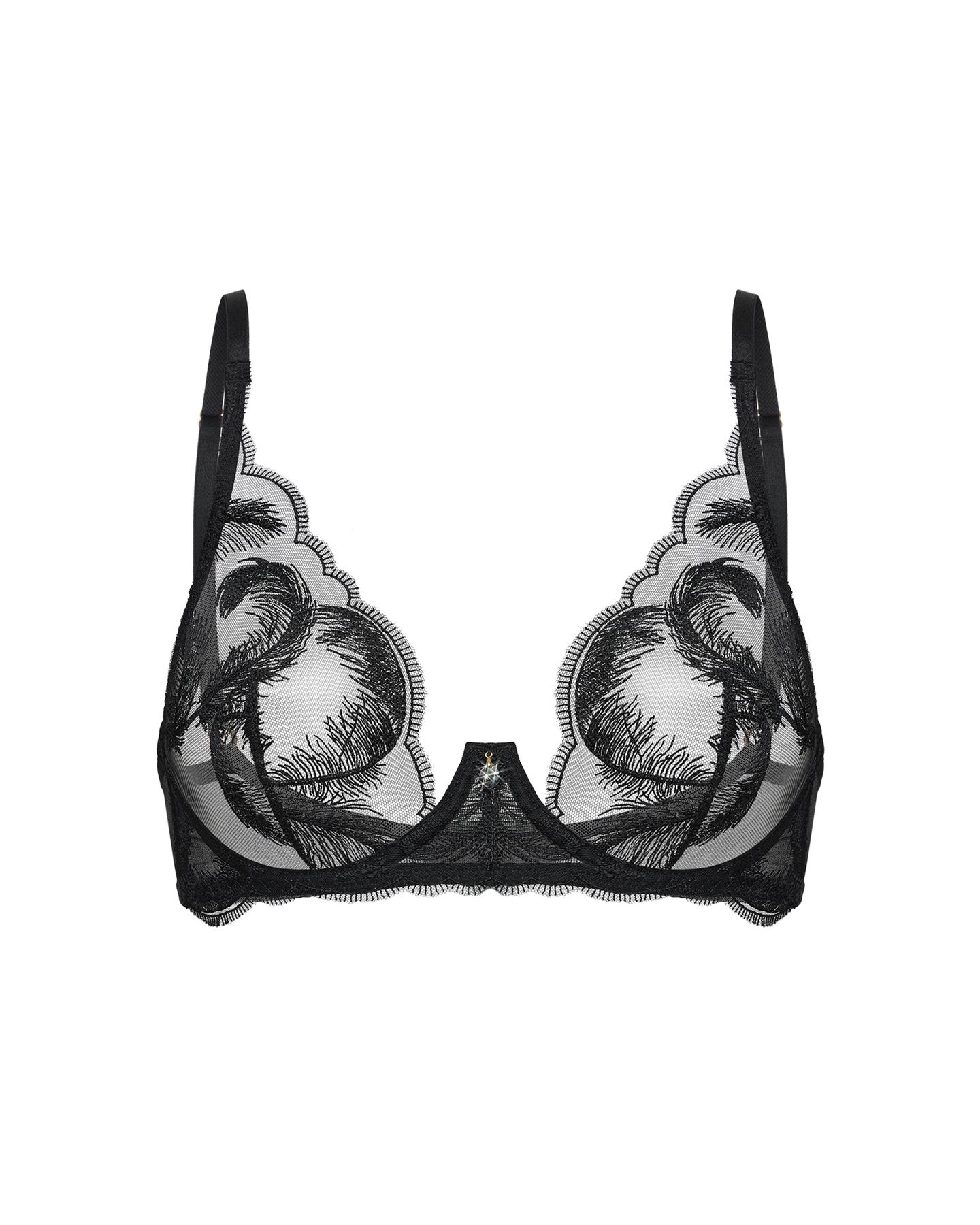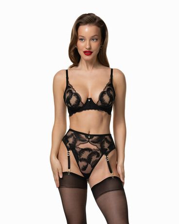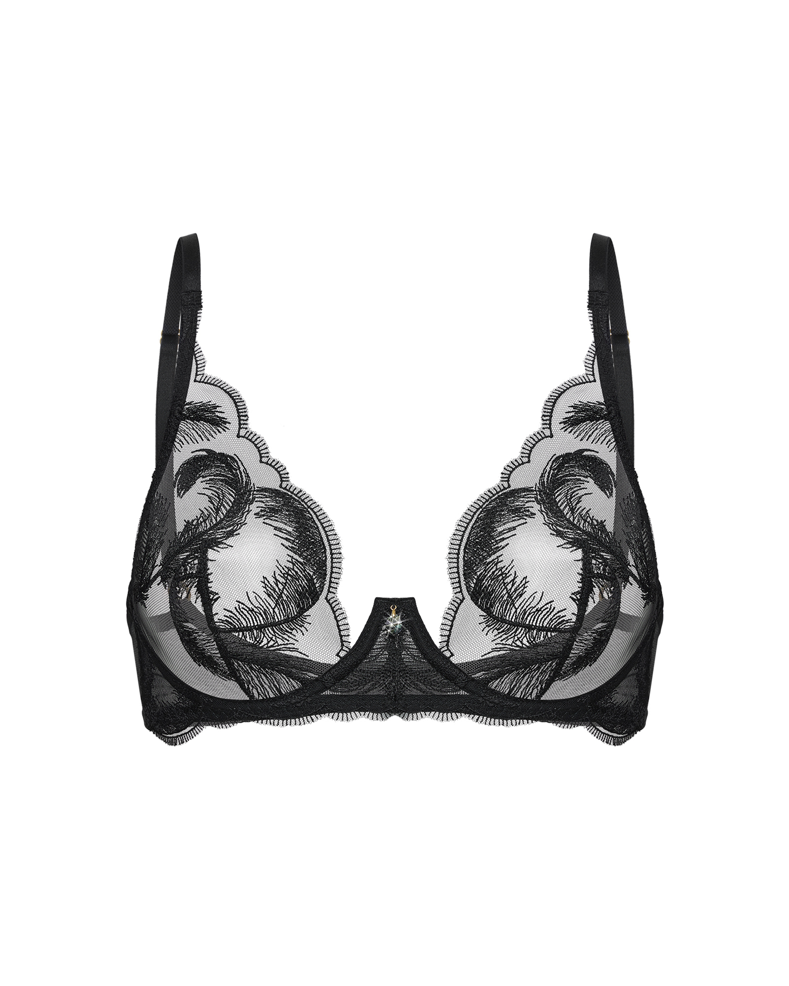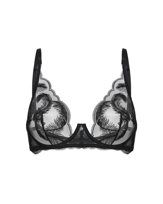 Мягкая чёрная сетка с вышивкой в виде лёгких перьев создаёт эффект парящей тени на коже, подчёркивая естественные линии тела.