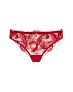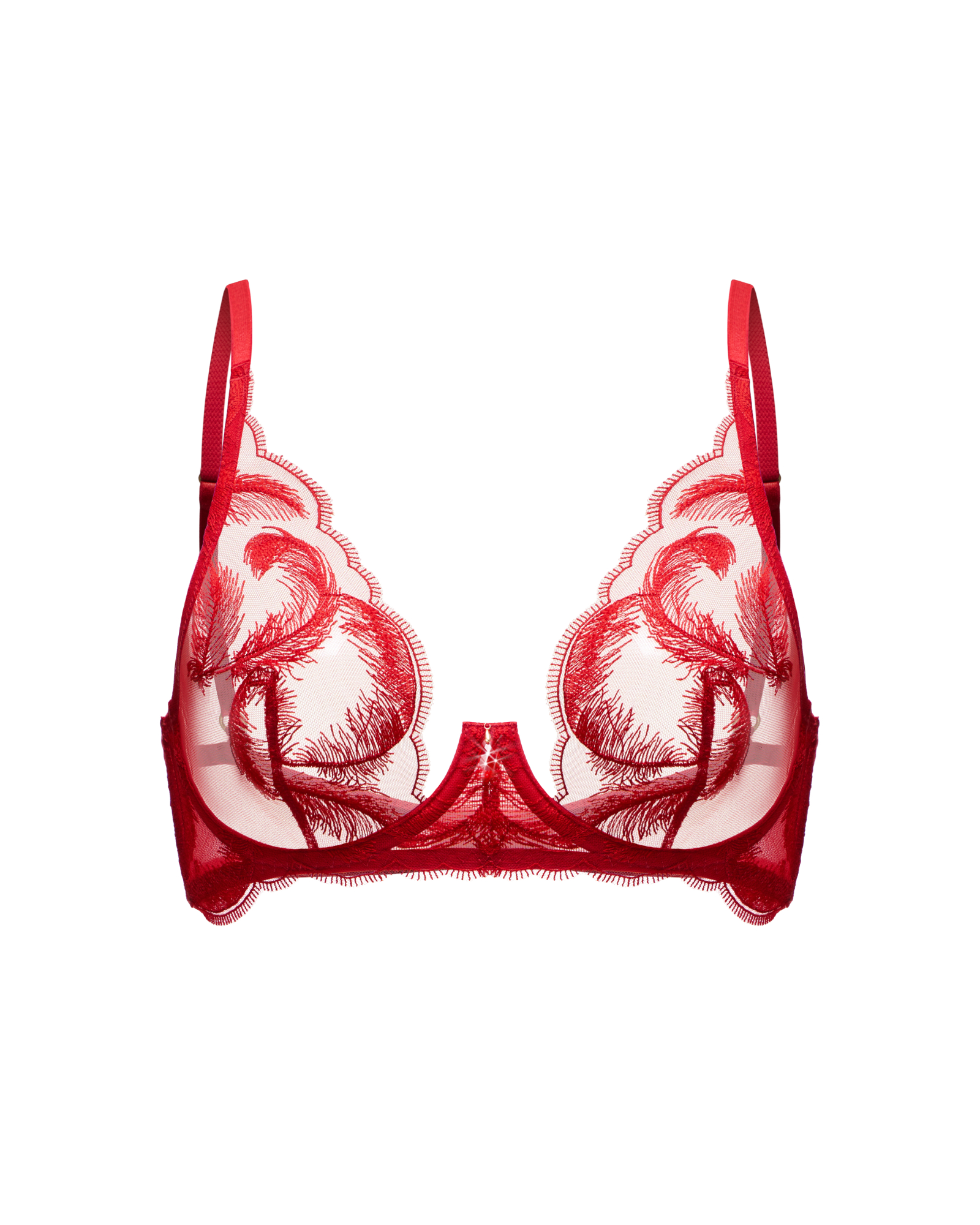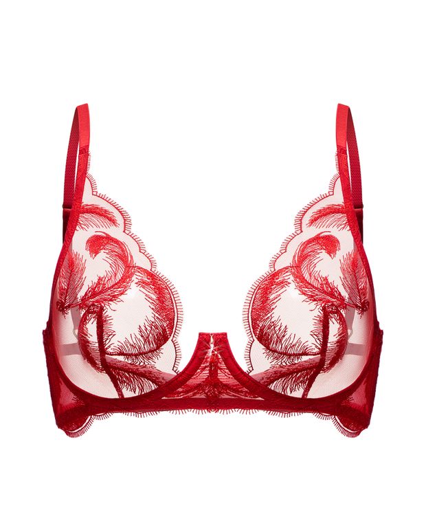 Мягкая красная сетка с вышивкой в виде лёгких перьев создаёт эффект парящей тени на коже, подчёркивая естественные линии тела.