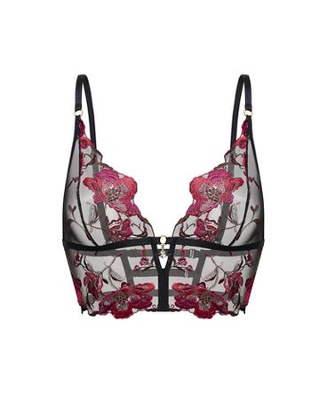 Бралетт Imogen создан для тех, кто выбирает выразительность без компромиссов. Модель выполнена из прозрачной чёрной сетки, превращённой в полотно для насыщенной флористической вышивки. Глубокий вырез подчёркивает линию груди, а вышитые алые маки создают эффект объёмного рисунка на коже.