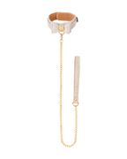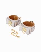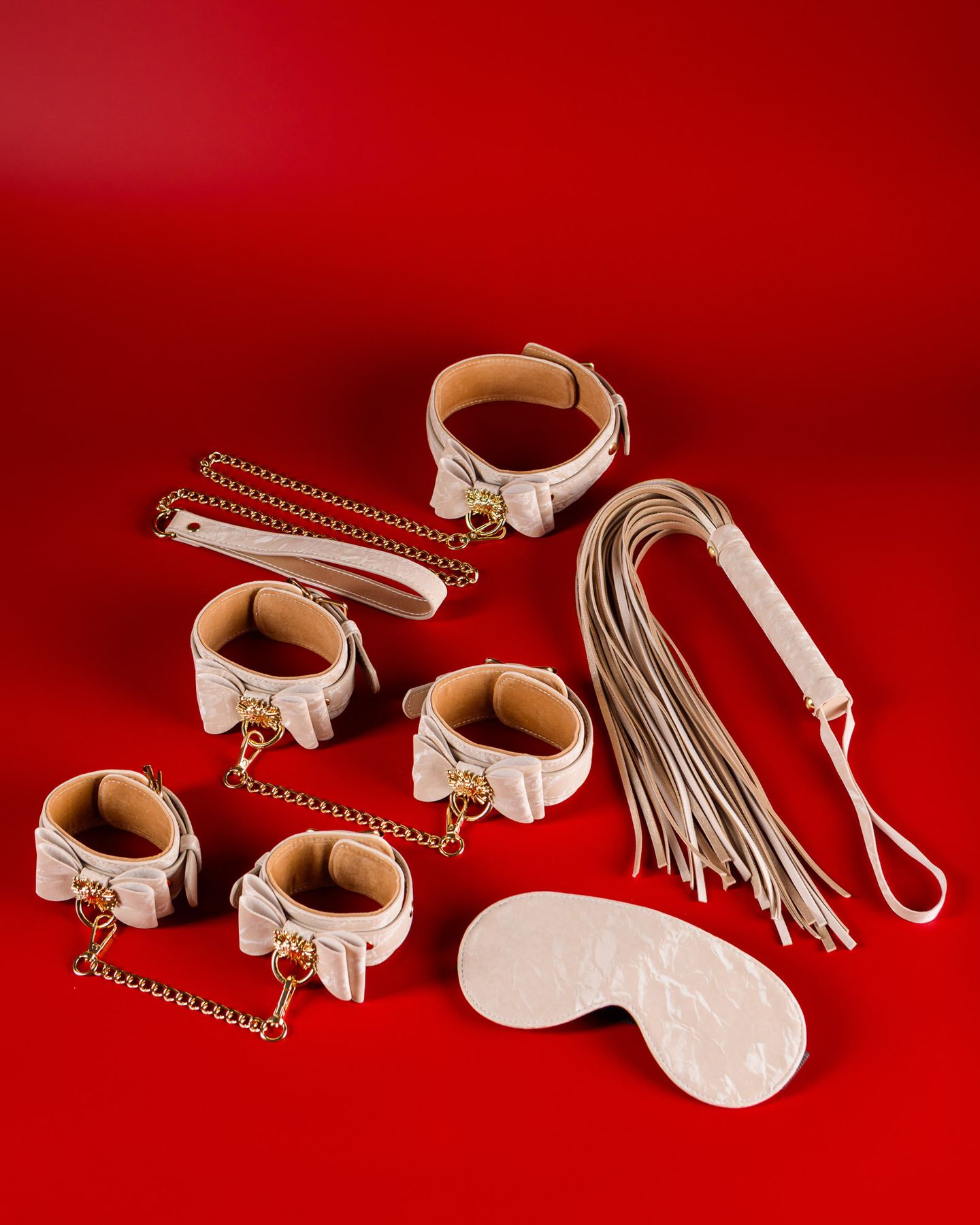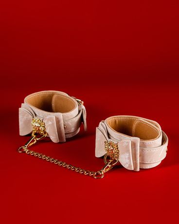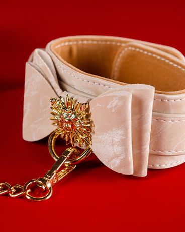 Продолжение эстетики коллекции «Forbidden games» — браслеты-наручники для ног в оттенке Blush. Выполненные из декоративной кожи с матовой бархатистой фактурой, они подчёркнут утончённую провокацию и создадут полный образ. Украшены кожаными бантами и золотыми элементами. Съёмная цепочка позволяет варьировать сценарии использования.