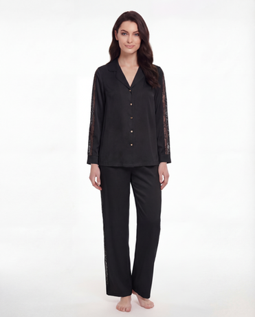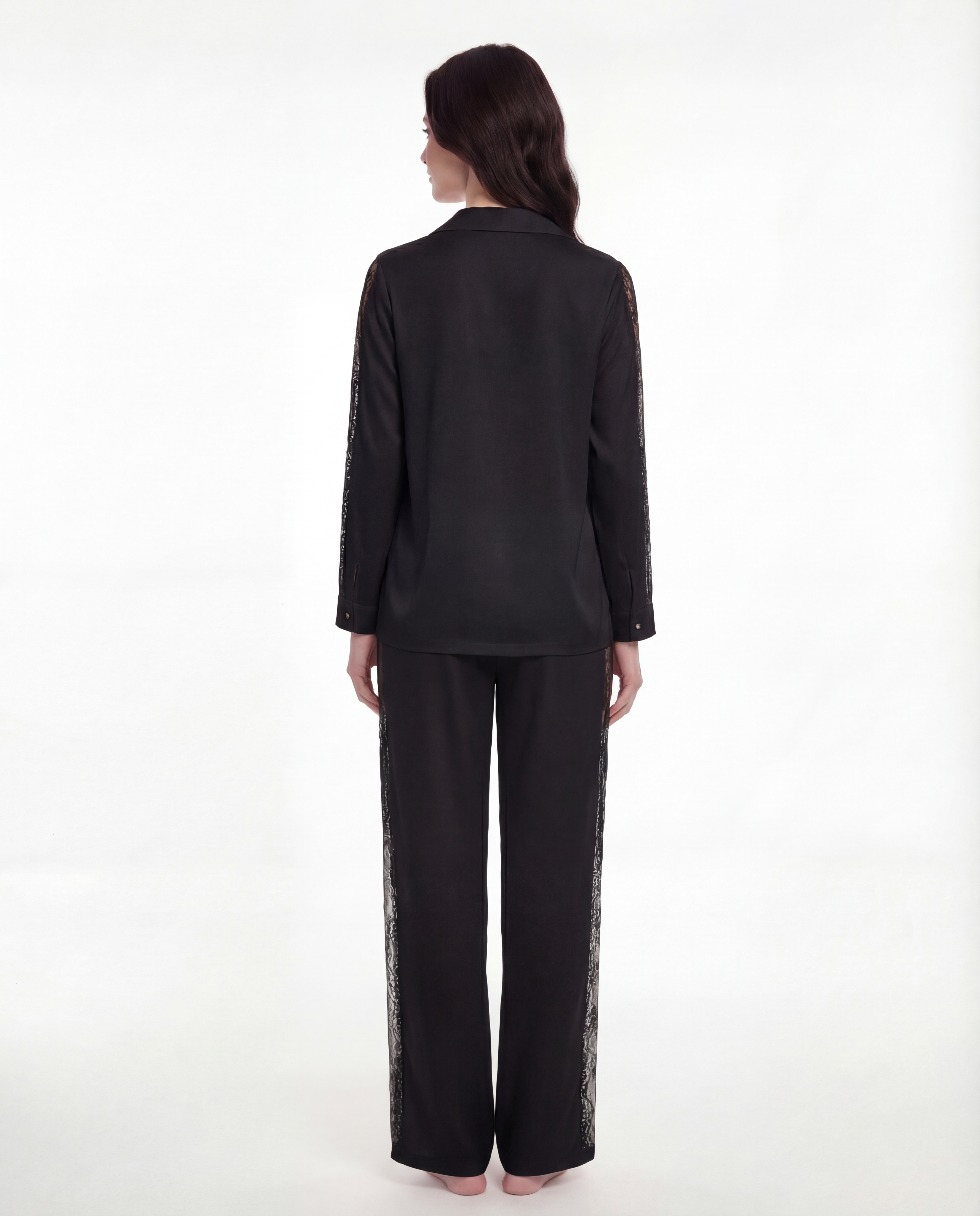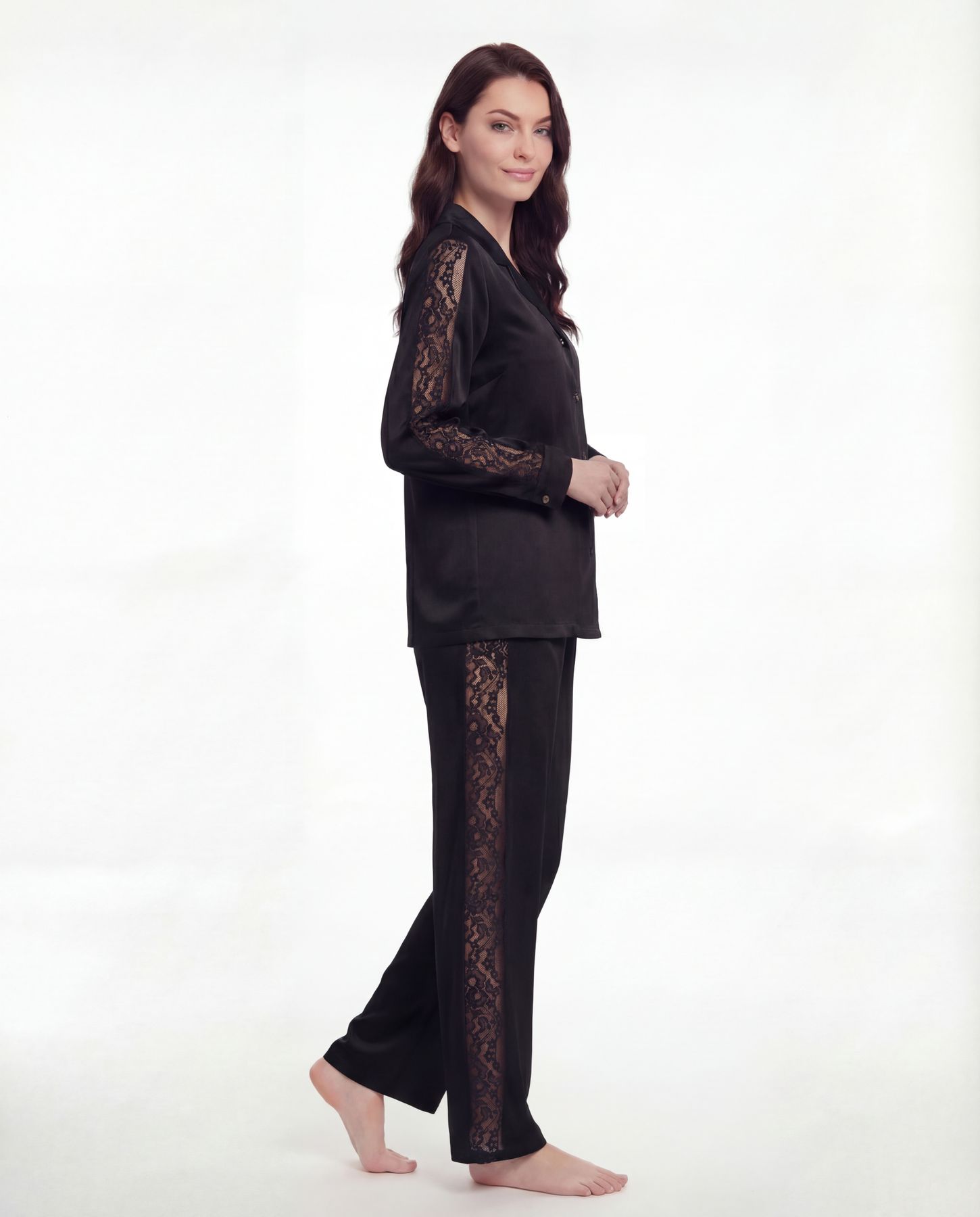 Эти брюки созданы для того, чтобы напоминать: не обязательно выходить из дома, чтобы чувствовать себя красивой. Модель с высокой посадкой выполнена из мягкого, приятного к телу материала и дополнена вставками из кружева по бокам — акцент, который визуально вытягивает силуэт и подчёркивает уверенную женственность.