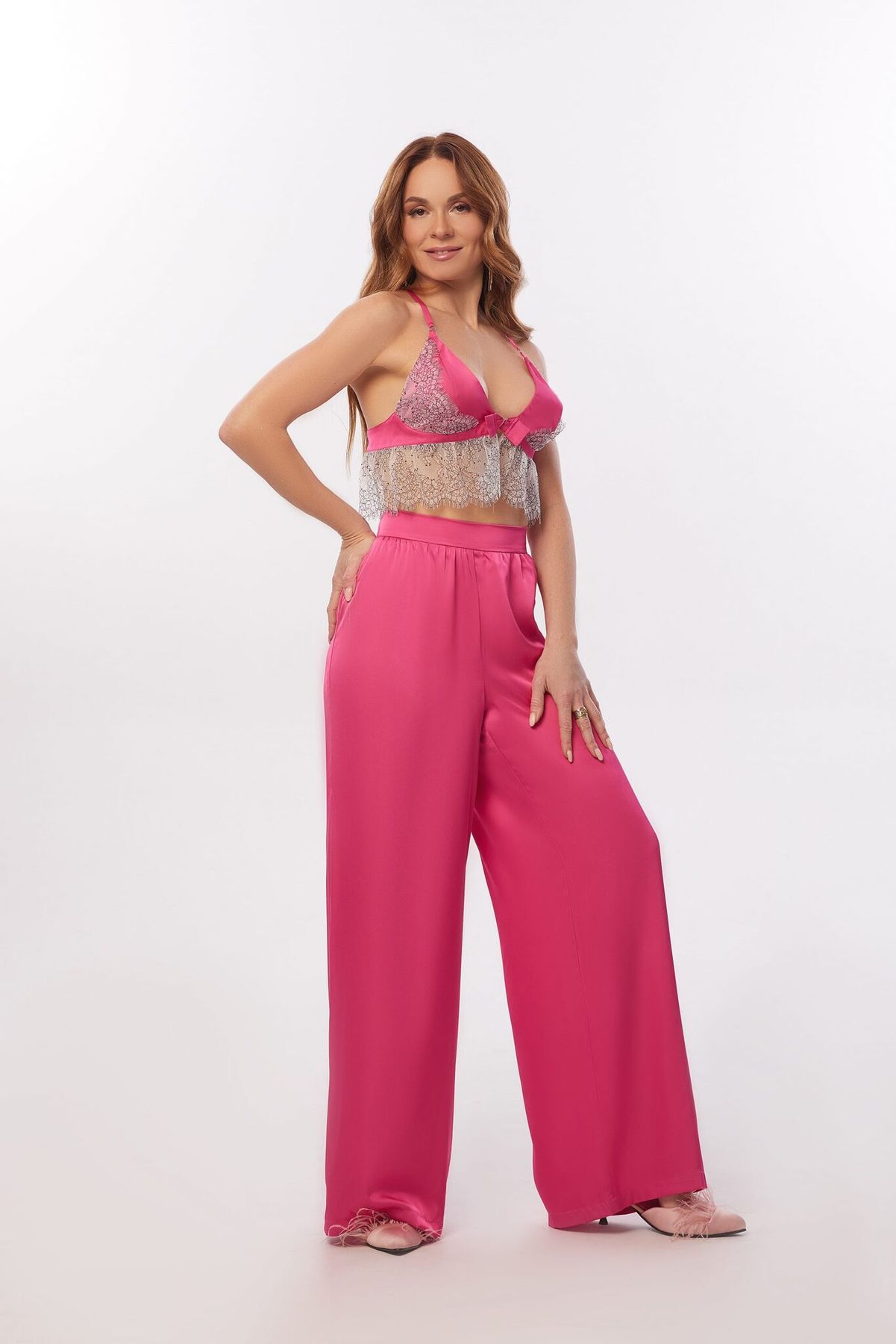 Эта модель входит в пижамный ансамбль Serena — трио из топа с кружевом шантильи, шорт и брюк. Комплект одинаково хорош как для сна, так и для роскошных образов дома. Его можно носить по отдельности или сочетать с халатом Matilda из коллекции шёлка Scandale Manière.