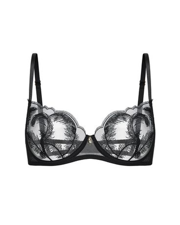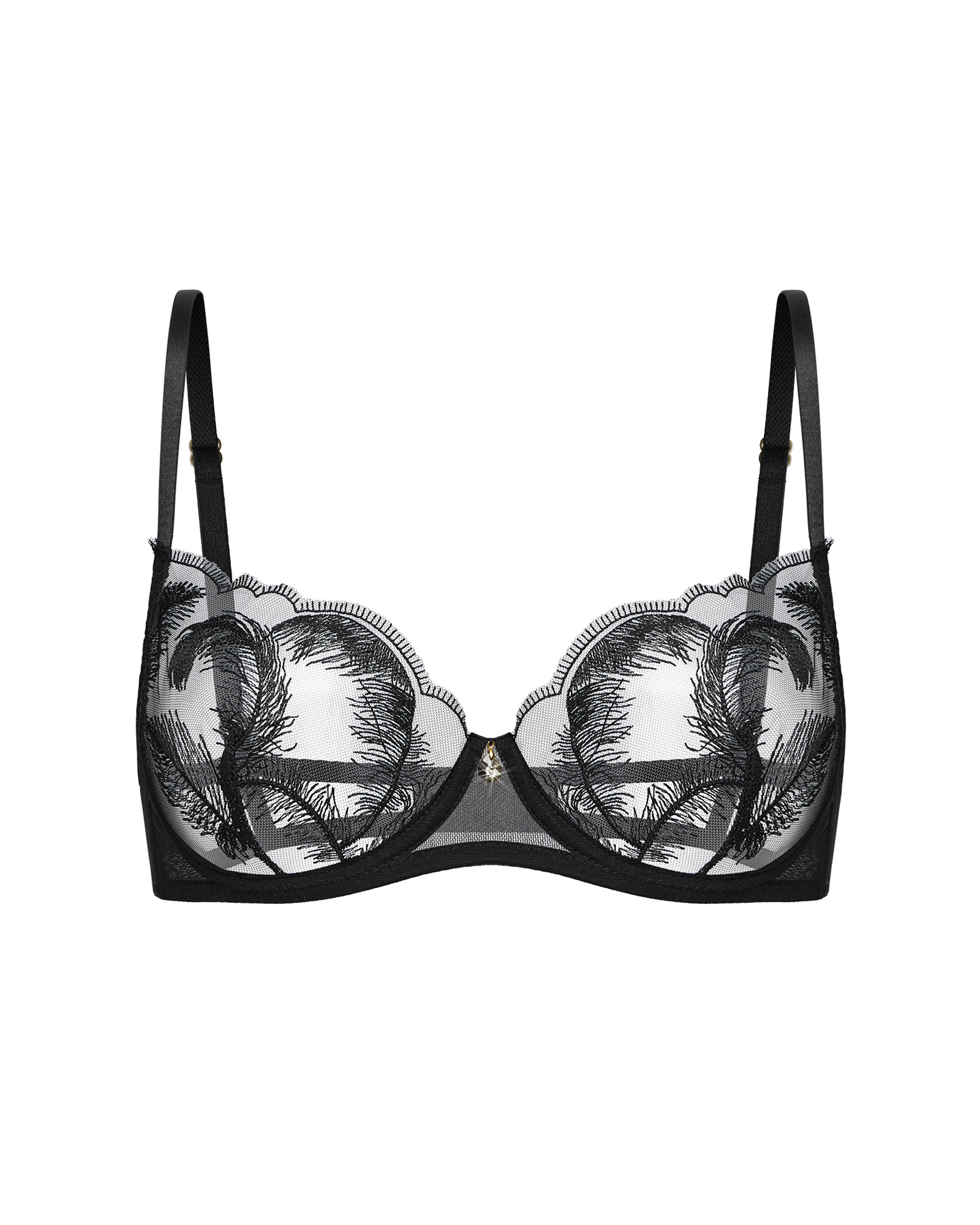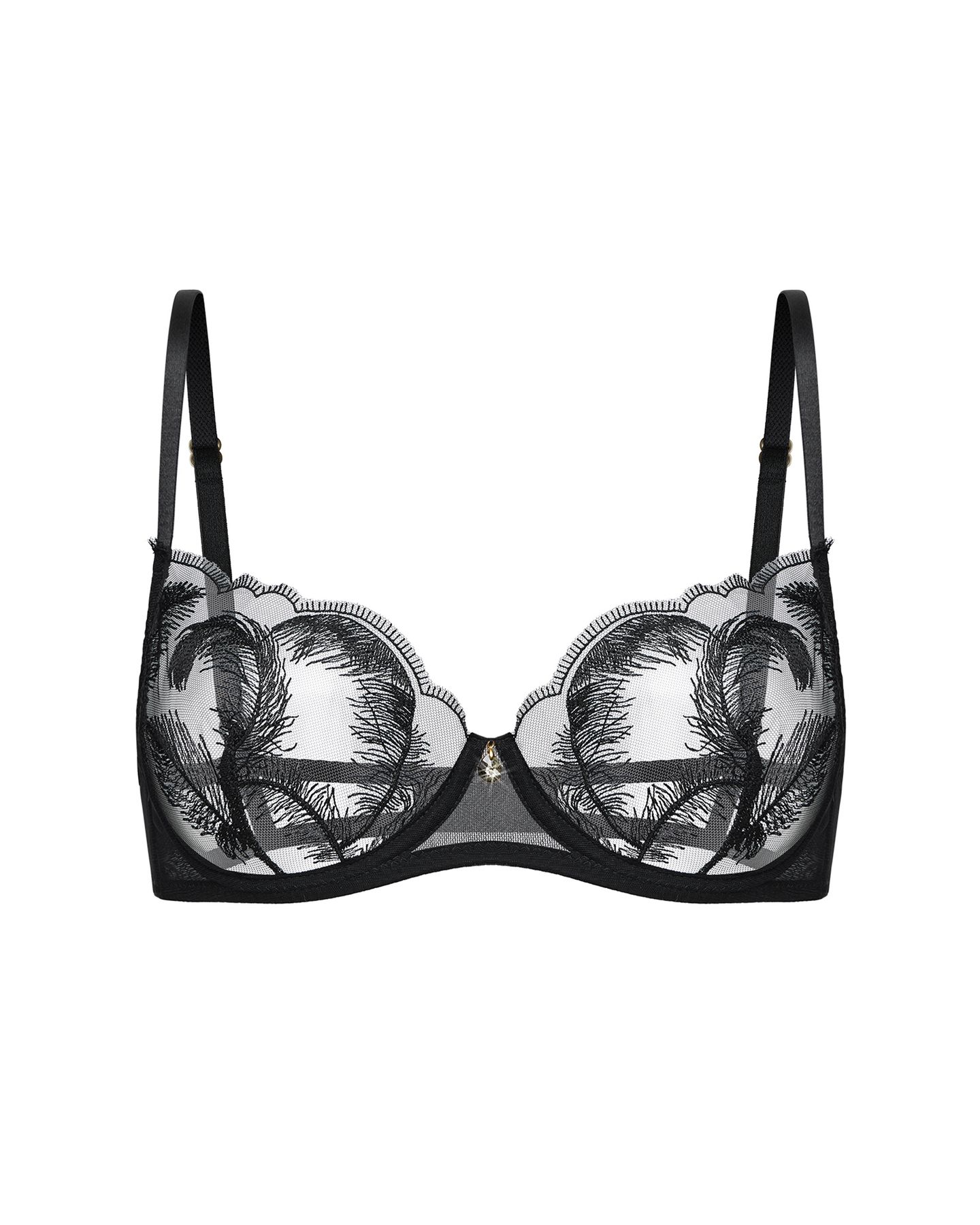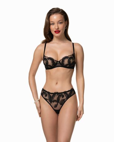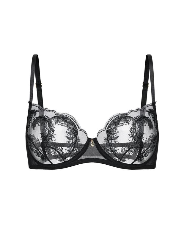 Балконетт на косточках из тонкой чёрной сетки украшен вышивкой в виде воздушных перьев, которые будто парят над кожей. Полупрозрачные чашки мягко формируют линию груди и создают визуальный поддержку без лишнего объёма, а гладкие внутренние швы обеспечивают комфорт в течение дня.