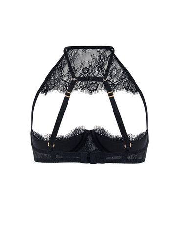 Эффектный бюстгальтер на каркасе из кружева шантильи с открытой формой чашки подчёркивает грудь, не скрывая её, а акцентируя. Лёгкая фиксация за счёт каркаса и продуманная архитектура стрепов создают чувственный силуэт и придают модели графичность.