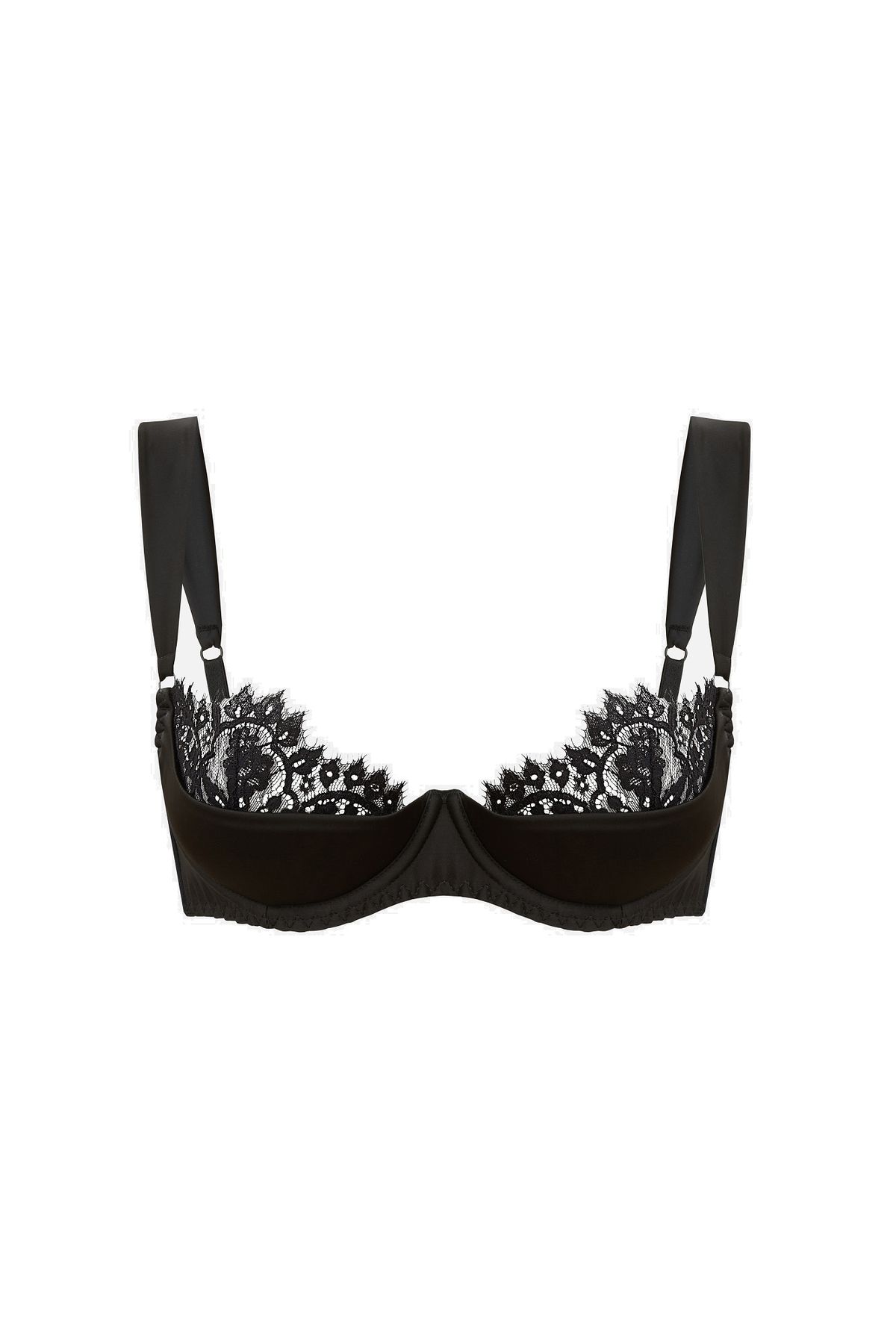 Opera black — бюстгальтер на косточках, сочетающий визуальную лёгкость кружева Шантильи и поддержку формованной конструкции. Нижняя часть чашек выполнена с лёгким уплотнением для усиленной фиксации и приподнятого силуэта, в то время как верхняя часть остаётся прозрачной и деликатной.