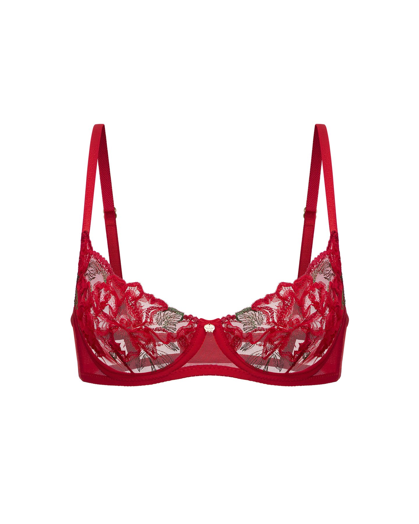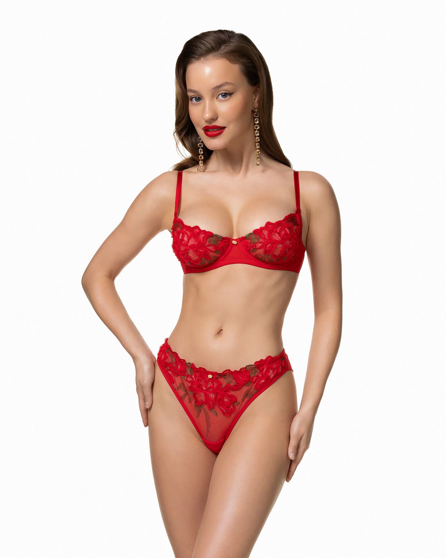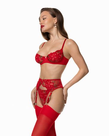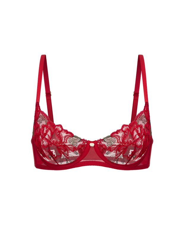 Бюстгальтер Passion — воплощение пульсирующей энергии и женской силы. Объёмные пионы цвета спелого граната, вышитые на эластичной сетке алого оттенка, создают эффект живого кружева, будто движущегося на коже. Каждый лепесток выполнен из нитей красного, гранатового и рубинового тонов, а ювелирно проработанные листочки приподняты тонкой лентой, формируя иллюзию рельефа и глубины. Балконет на косточках подчёркивает линию груди и открывает зону декольте, превращая изделие в объект искусства. Модель завершена фирменной золотой фурнитурой и вручную пришитым символом орхидеи Scandale Manière — знаком внутренней силы и притягательности.