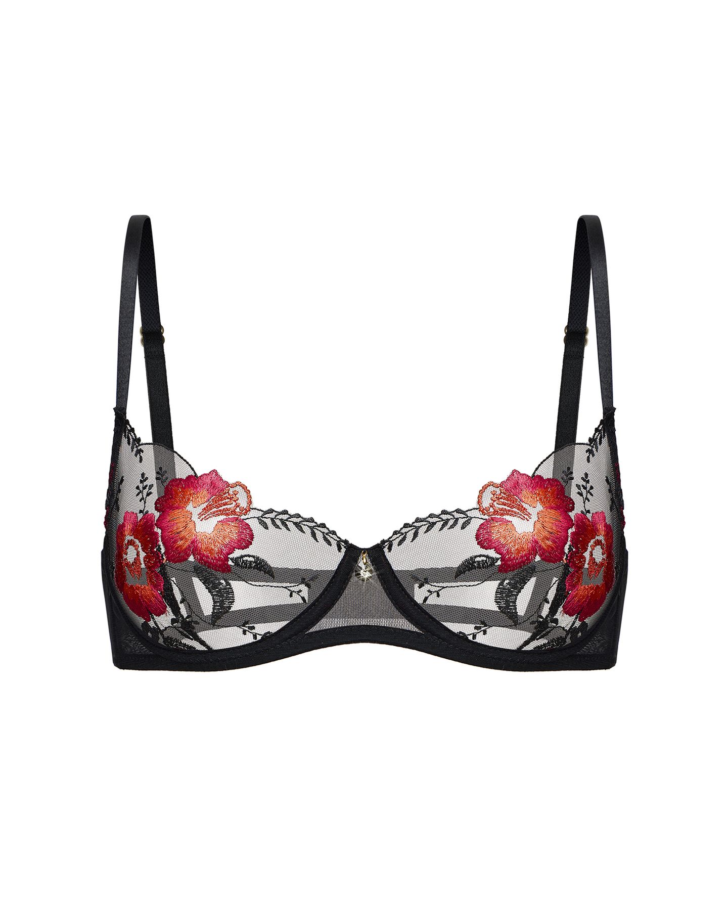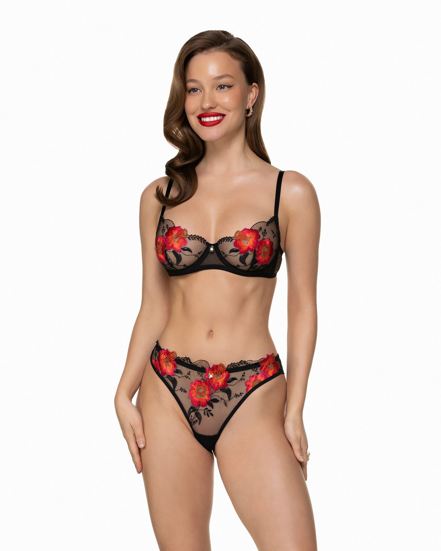 Бюстгальтер Phoenix Noir соединяет драматичность и утончённость. Модель с классическими мягкими чашками на косточках выполнена из прозрачной чёрной сетки, которая становится фоном для алых амариллисов, вышитых с высокой точностью. Яркие лепестки создают эффект пламени, подчёркивая контуры груди без утяжеления.