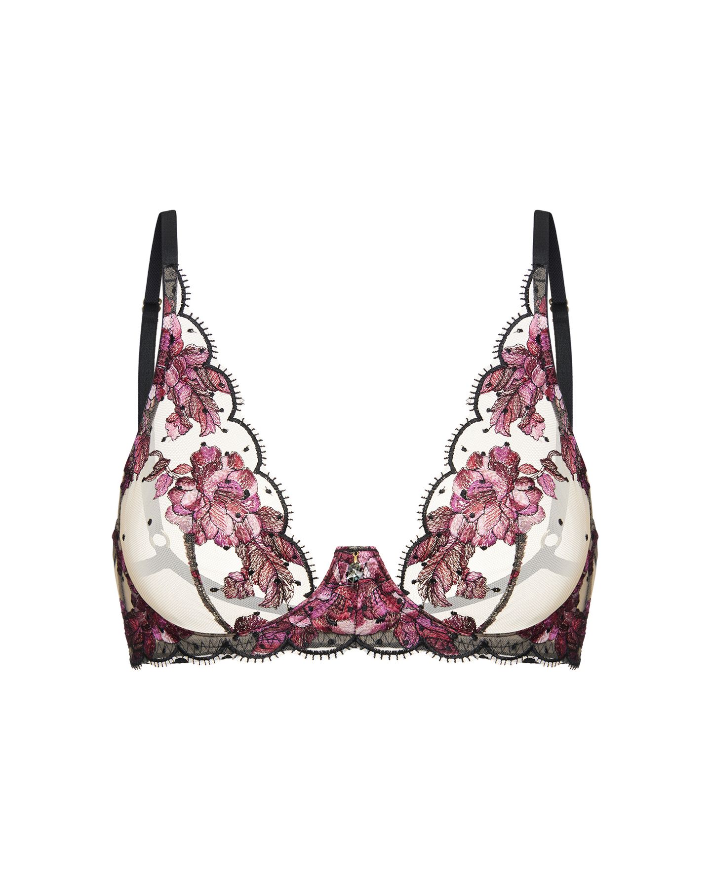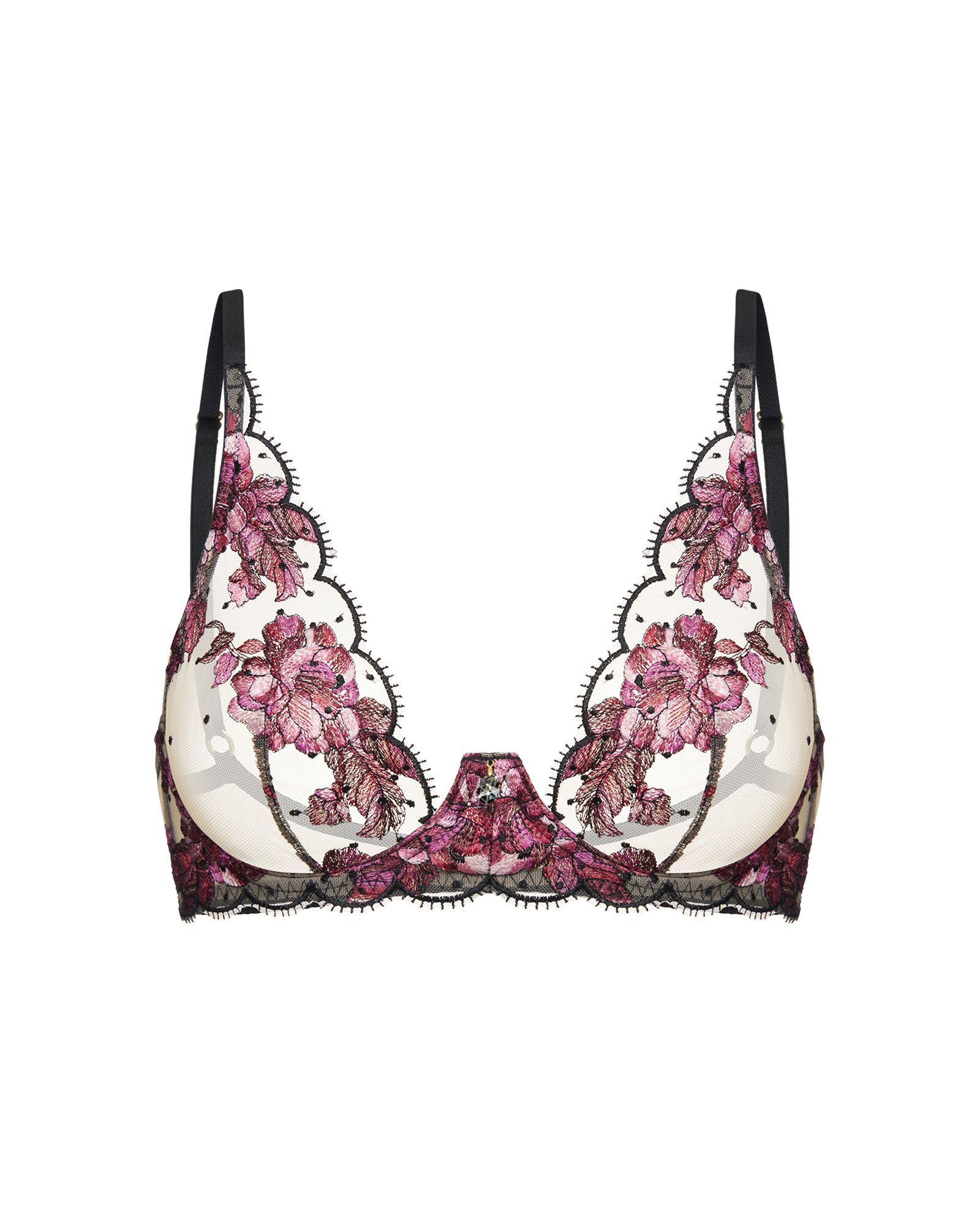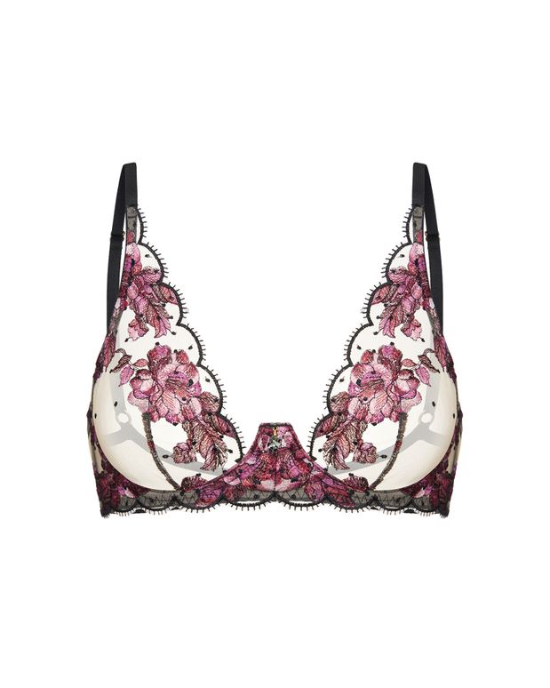 Бюстгальтер Rosa — это визуальная поэма о нежности и силе. Чашки на косточках с завышенной серединой формируют открытую линию декольте, а телесная сетка сливается с тоном кожи, превращаясь в прозрачный холст для ярких акварельных роз.