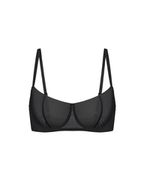 Мягкие чашки с вертикальной вытачкой выполнены из двойного слоя эластичной сетки — они повторяют контуры тела и визуально приподнимают грудь. Каркас средней глубины направляет грудь вверх и к центру, создавая изящный и открытый V-образный вырез.