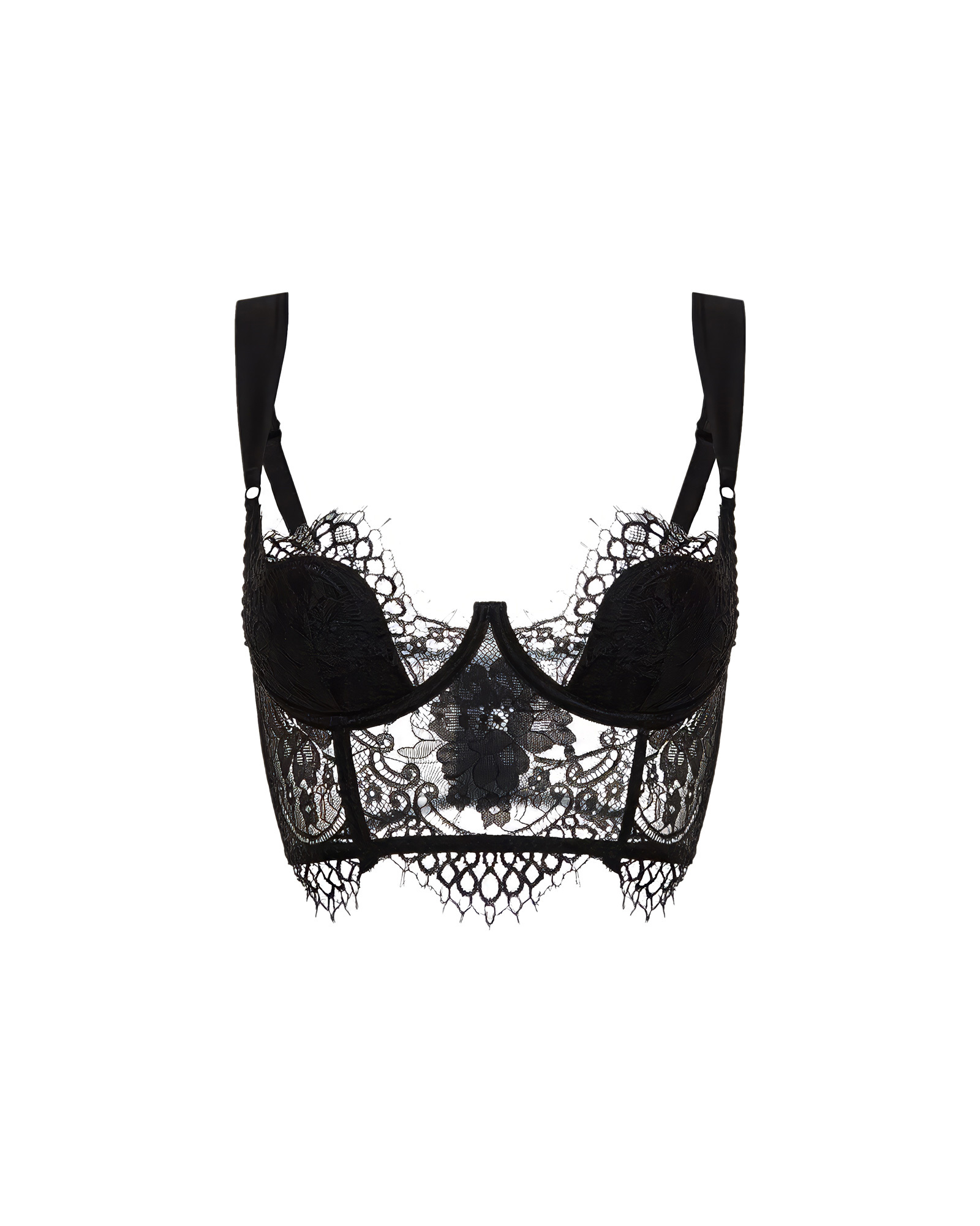 Кружевное бюстье в чёрном цвете создано, чтобы подчеркнуть женственность и придать образу чувственность. Полупрозрачное кружево с изящным узором формирует соблазнительный силуэт, а удлинённая линия корпуса делает модель ещё более выразительной. Чашки на каркасах обеспечивают поддержку и красивую форму груди, а широкие бретели регулируются для точной посадки.