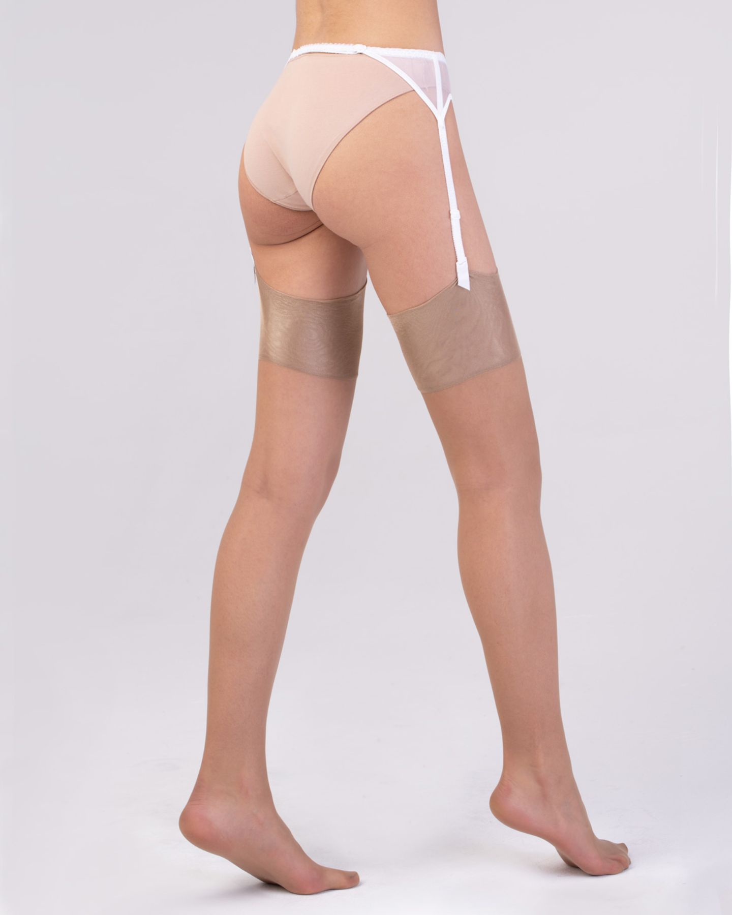 Изделие выполнено под пояс, что подчёркивает винтажную эстетику и обеспечивает надёжную фиксацию. Уплотнённый мысок повышает прочность в зонах нагрузки и продлевает срок службы. Благодаря эластичности материала, чулки мягко облегают ноги, подчёркивая их форму без заломов и перекручивания.