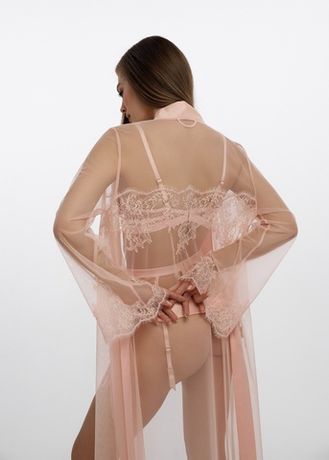 Длинный пеньюар Carlotta создан из лёгкой прозрачной сетки, украшенной цветочным кружевом, которое добавляет образу изысканной романтичности. Атласная отделка подчёркивает силуэт и придаёт комплекту утончённый блеск.