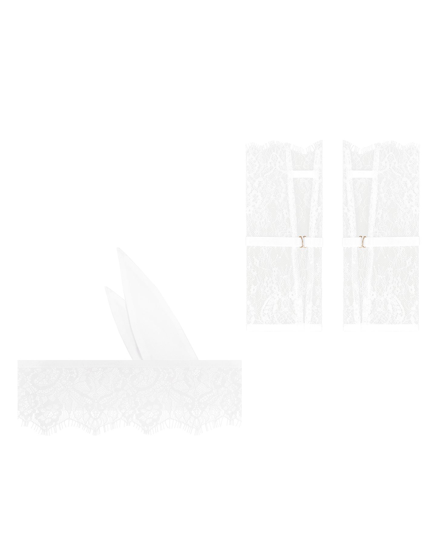 Финальный акцент, который превращает образ в игру. Кружевные гловелетты из коллекции Scandale Manière — перчатки без пальцев с аккуратной застёжкой на запястье, создающие настроение лёгкой провокации. Их дополняет тонкая кружевная повязка на глаза, размывающая границы реальности и открывающая пространство для фантазий.