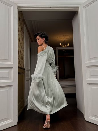 Халат Goddess от Scandale Manière — это Ваш личный ритуал красоты и уверенности. Выполненный из гладкого искусственного шелка, он мягко ложится на тело, даря ощущение лёгкости и комфорта. Расклешённые рукава украшены россыпью перьев, добавляющих игривую драматичность и утонченную женственность.