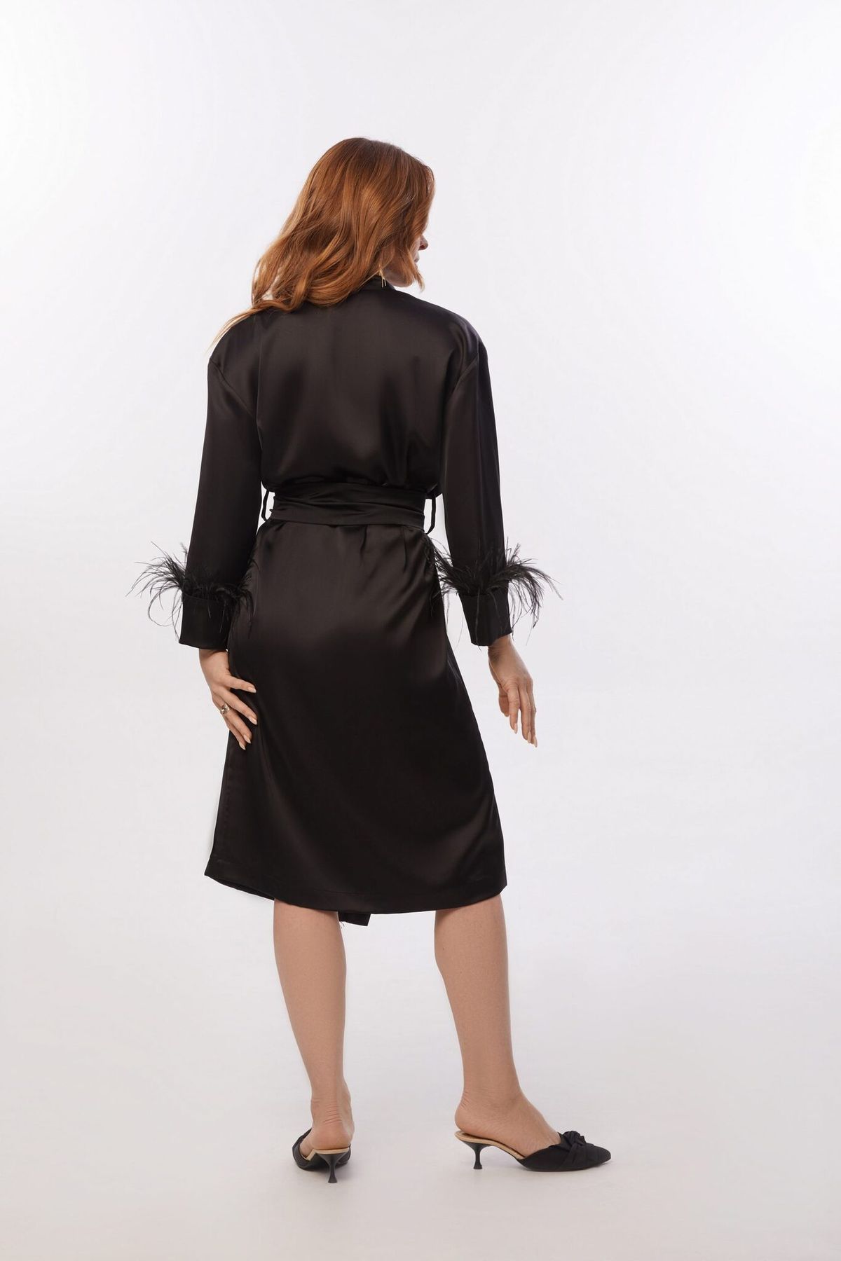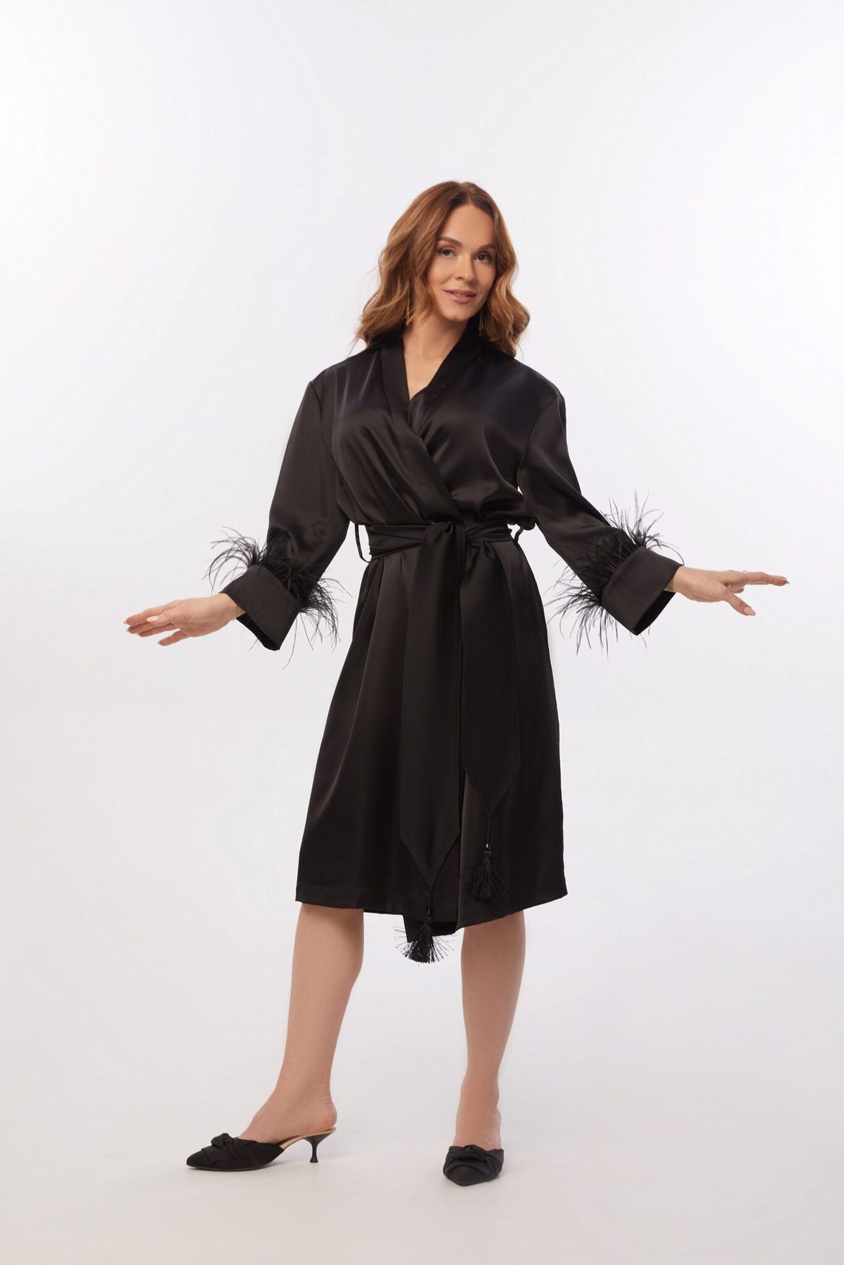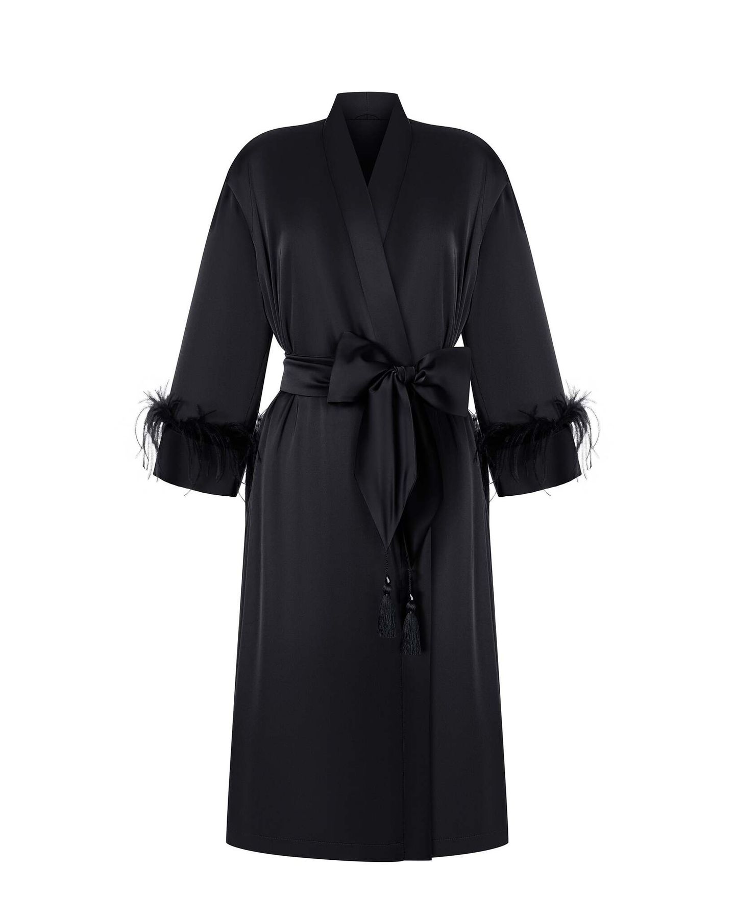 Шёлковый халат Matilda с отделкой из пера страуса создаёт выразительный образ — как дома, так и вне его. Благодаря плотной струящейся ткани и длине ниже колена, изделие трансформируется в платье-накидку, накидку поверх топа с брюками или вечерний образ в бельевом стиле.