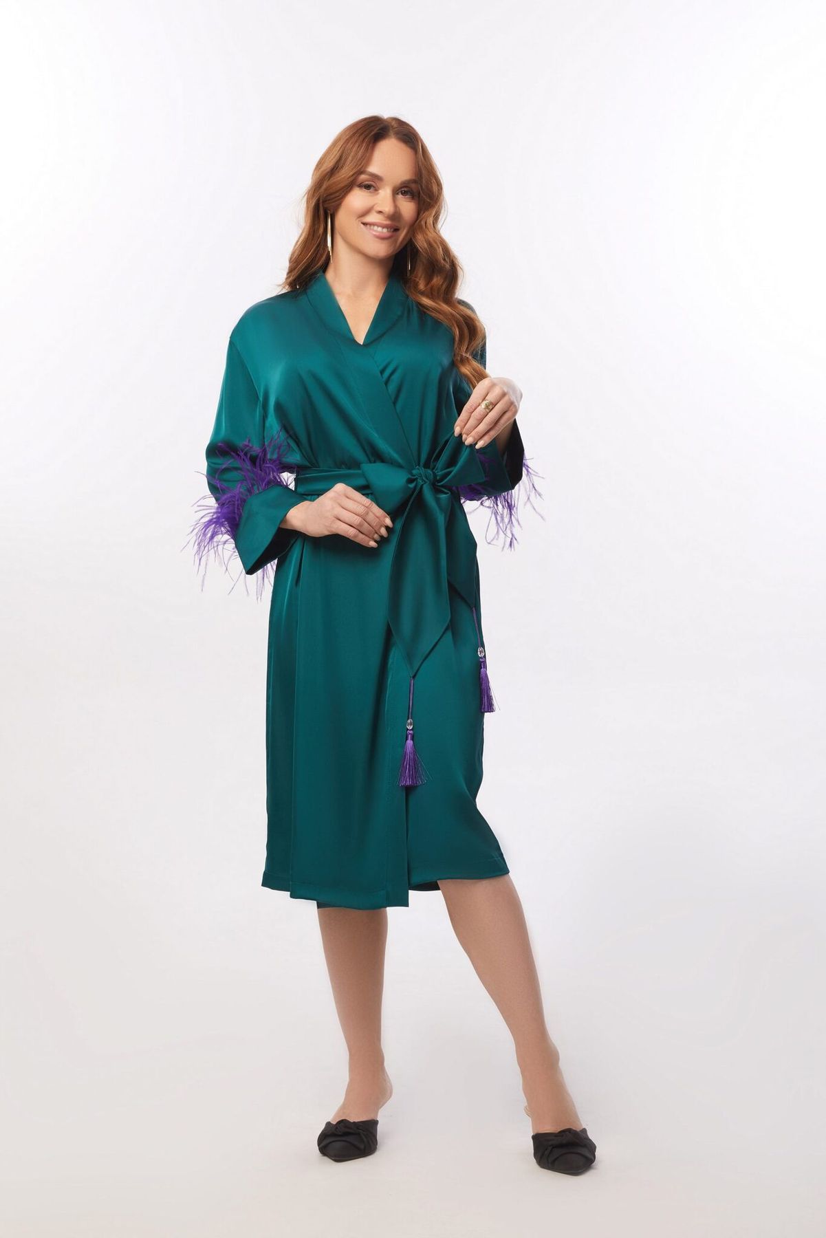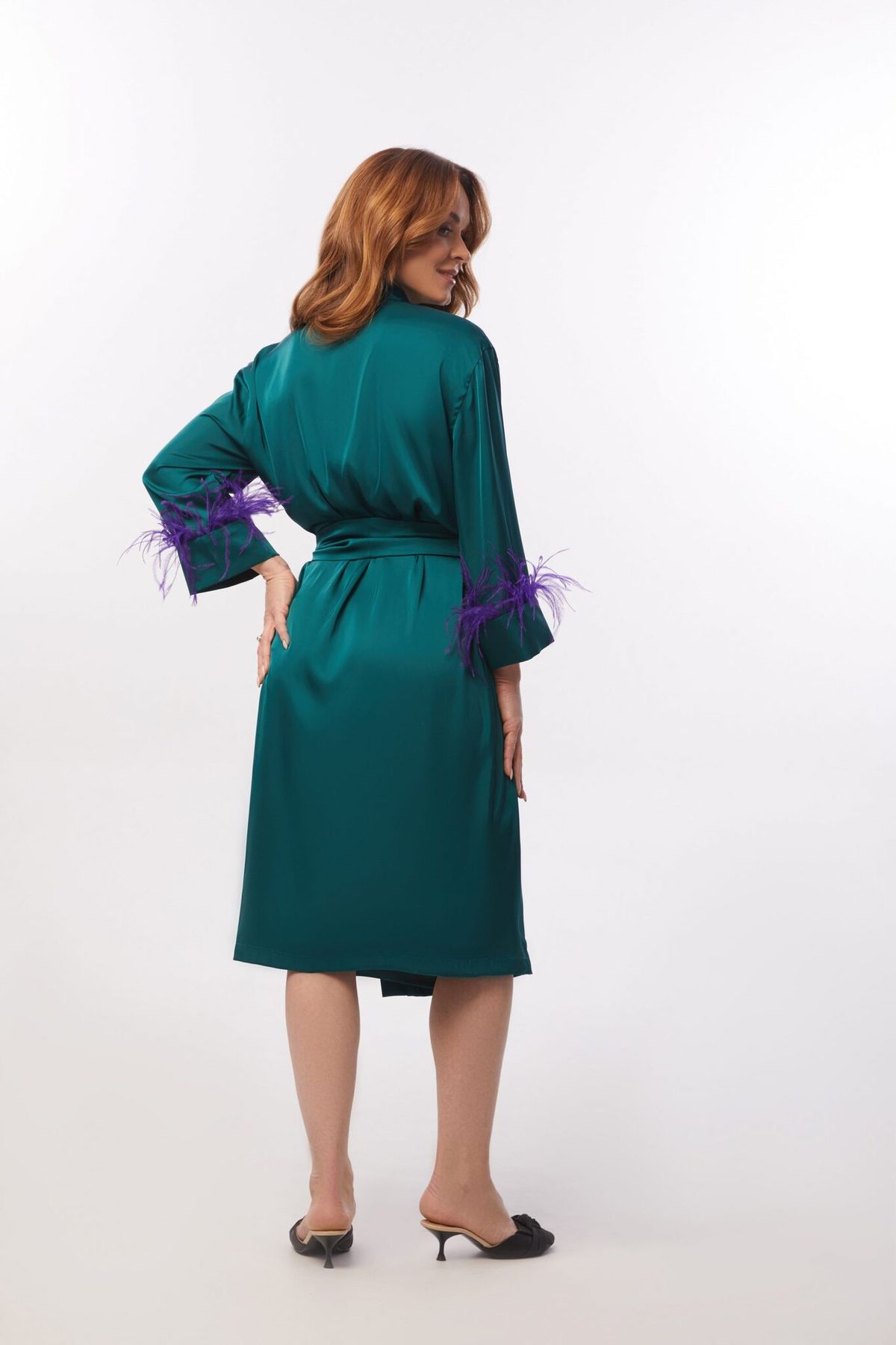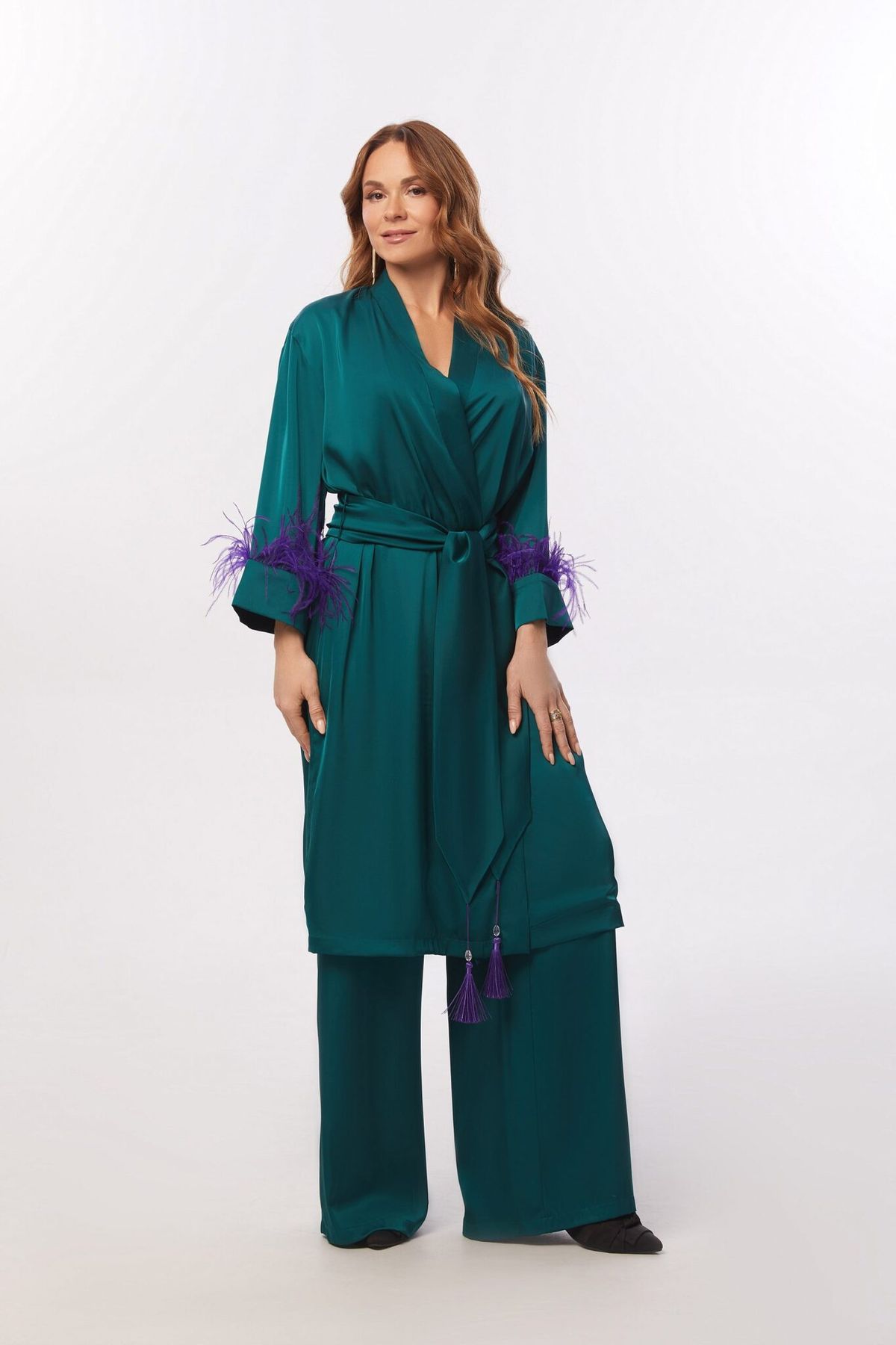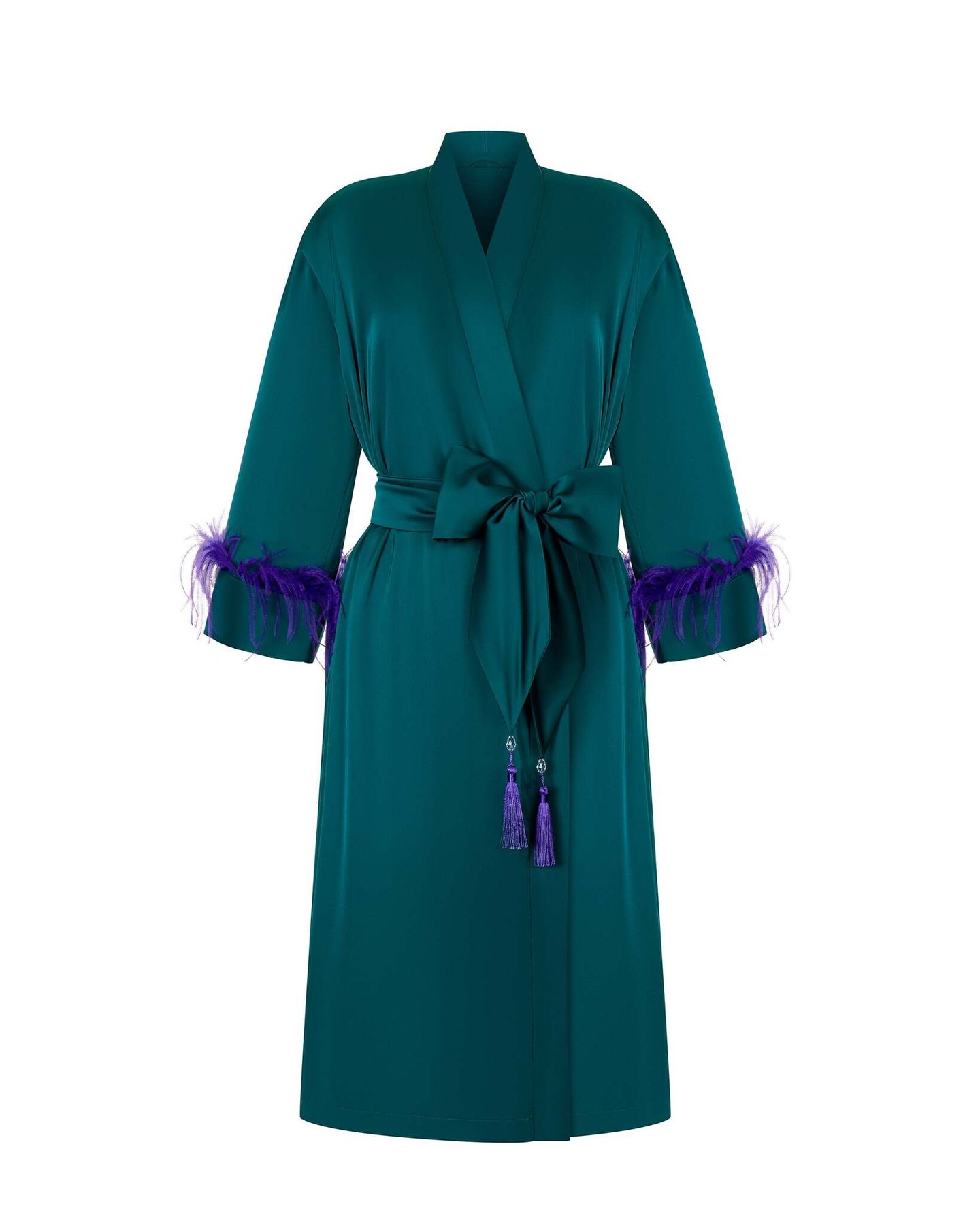 Шёлковый халат Matilda с отделкой из пера страуса создаёт выразительный образ — как дома, так и вне его. Благодаря плотной струящейся ткани и длине ниже колена, изделие трансформируется в платье-накидку, накидку поверх топа с брюками или вечерний образ в бельевом стиле.