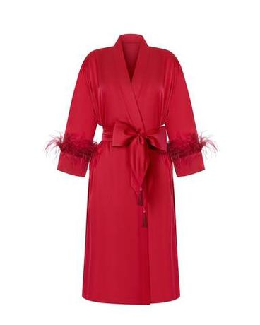 Шёлковый халат Matilda с отделкой из пера страуса создаёт выразительный образ — как дома, так и вне его. Благодаря плотной струящейся ткани и длине ниже колена, изделие трансформируется в платье-накидку, накидку поверх топа с брюками или вечерний образ в бельевом стиле.