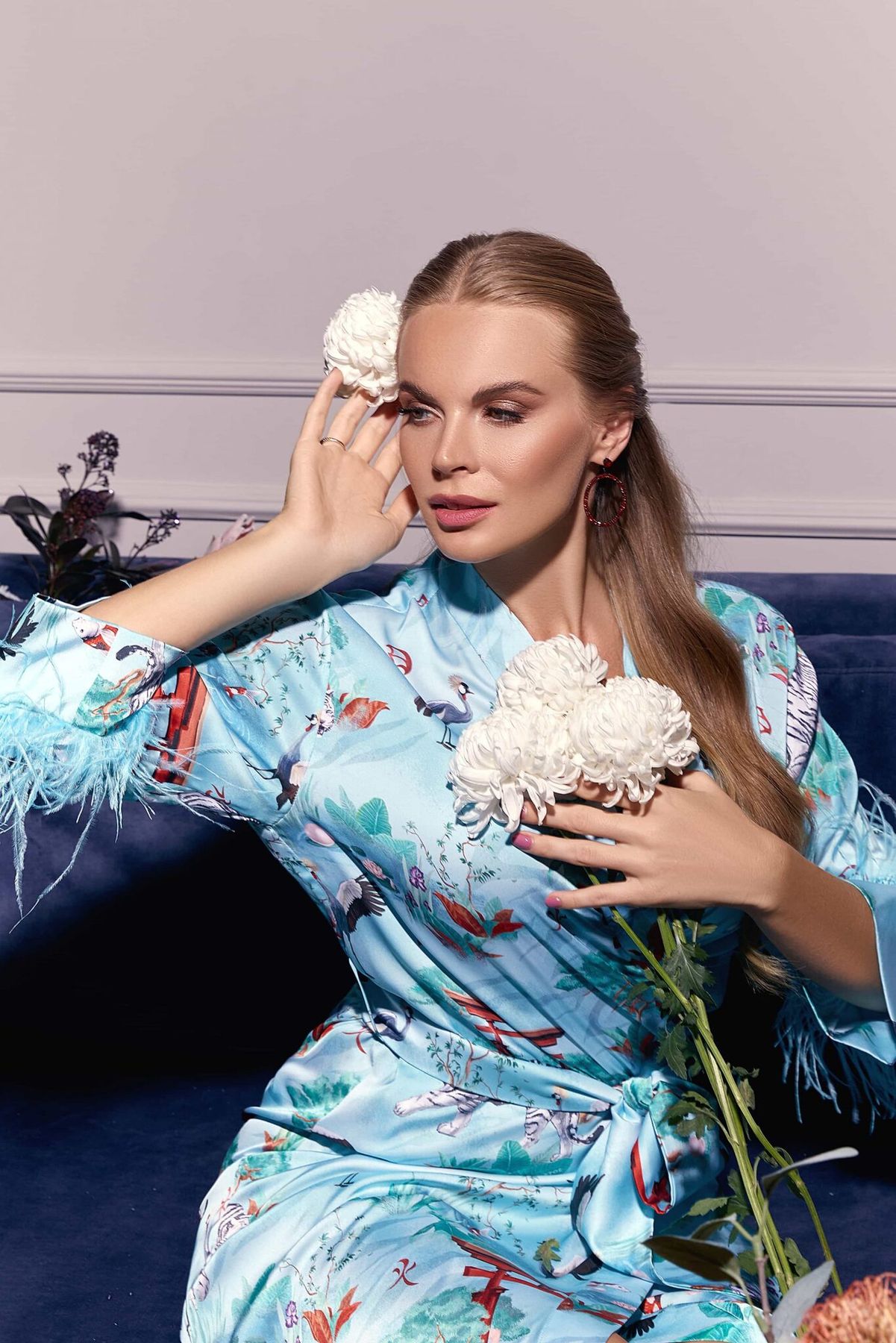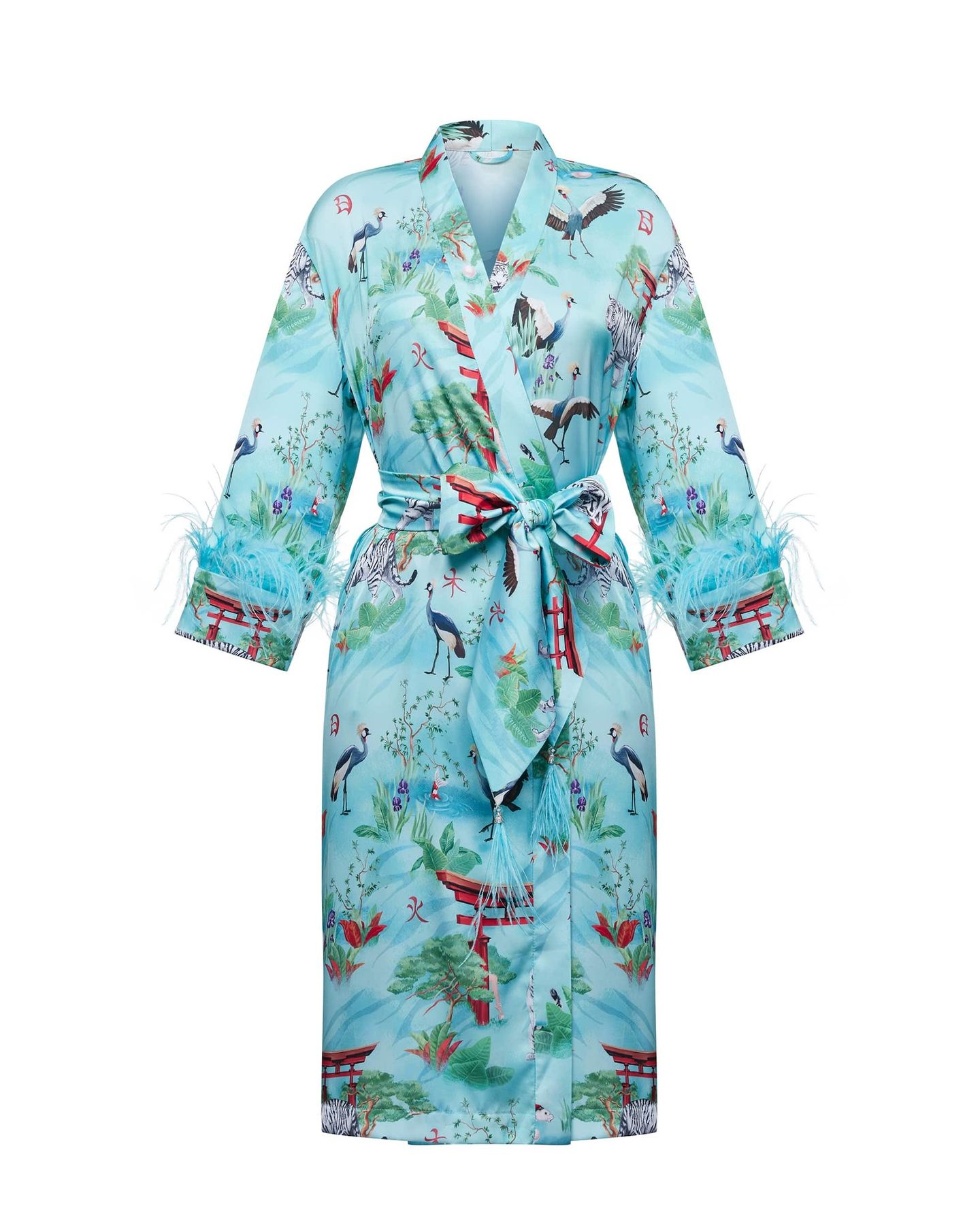 Халат Matilda Asia с отделкой из пера страуса — это образ вне времени, в котором встречаются голливудский шик и утилитарная функциональность. Его можно носить как самостоятельное платье или как накидку: на пижаму, топ с брюками или бельевое платье. Плотный искусственный шёлк красиво струится и не просвечивает, а длина ниже колена делает образ благородным и выразительным.
