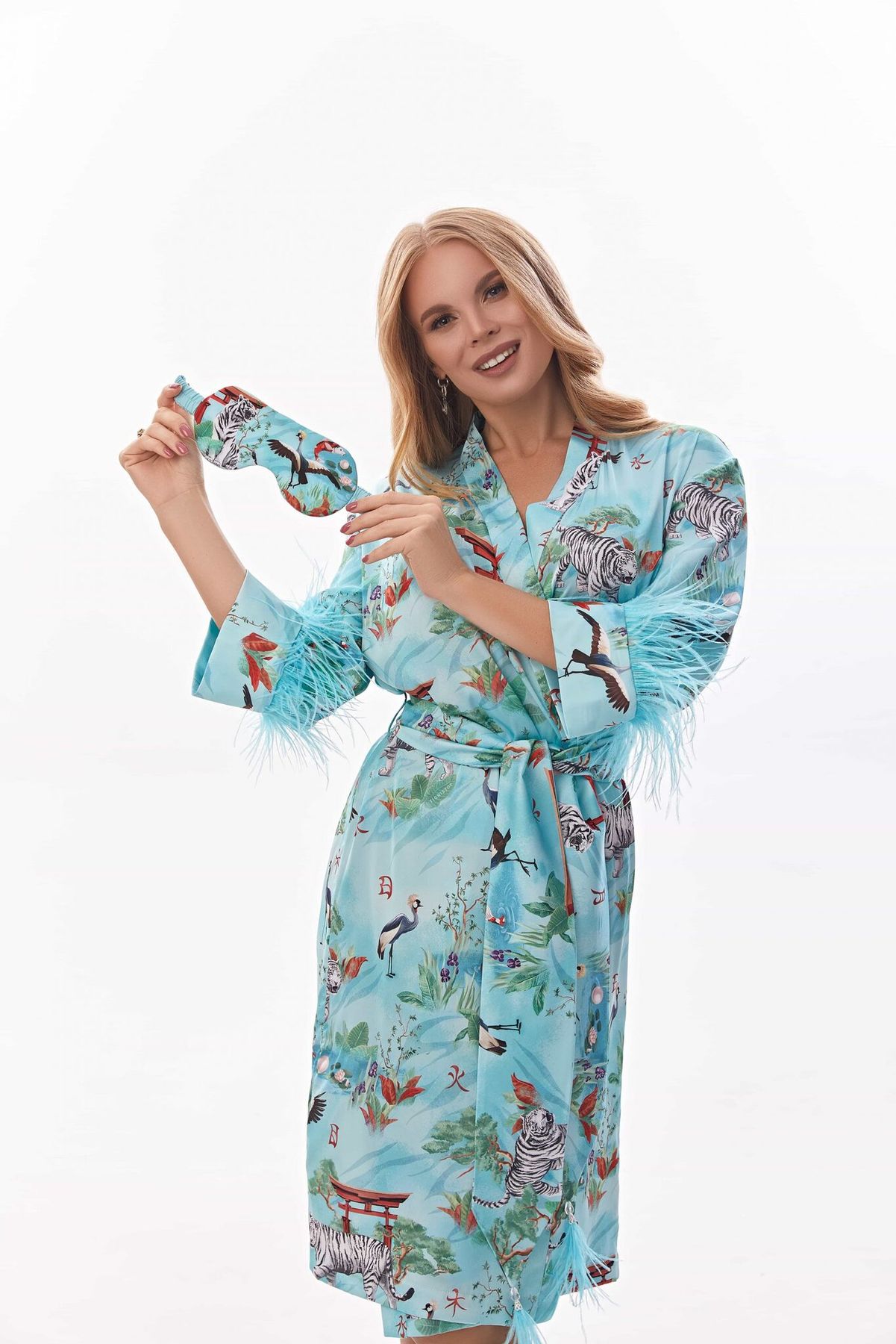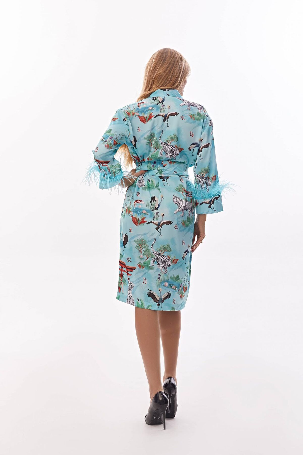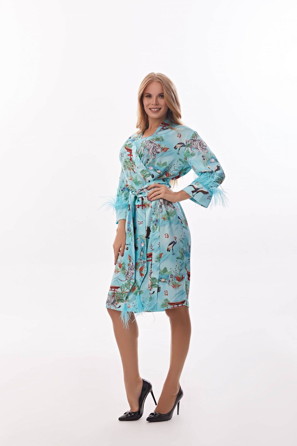 Рукава декорированы пером страуса, которое добавляет театральности и легкости в движении. Широкий пояс с кисточками можно завязать как акцентный бант или создать графичный силуэт, подчёркивая талию. Халат фиксируется на внутренние завязки и имеет петельку для вешалки — практичные детали, которые создают комфорт в использовании.