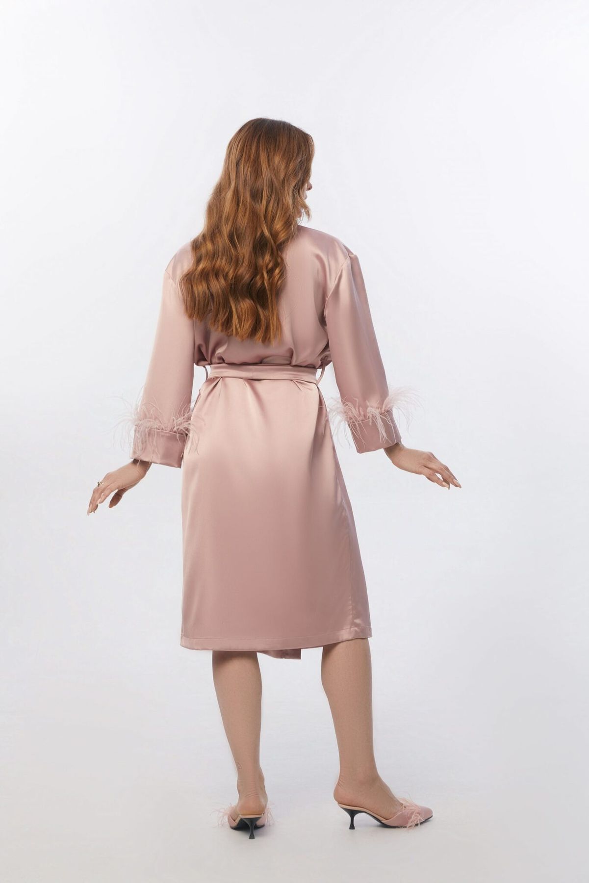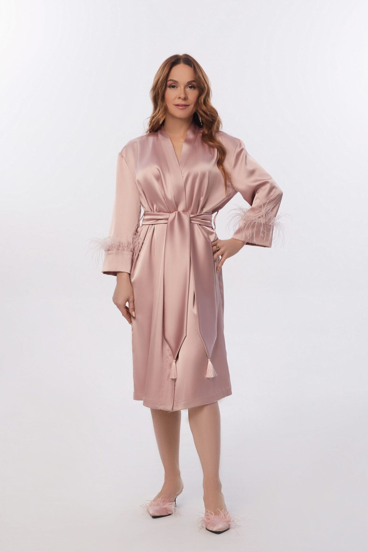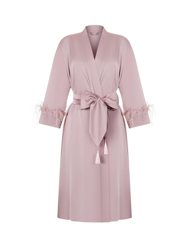 Шёлковый халат Matilda с отделкой из пера страуса создаёт выразительный образ — как дома, так и вне его. Благодаря плотной струящейся ткани и длине ниже колена, изделие трансформируется в платье-накидку, накидку поверх топа с брюками или вечерний образ в бельевом стиле.