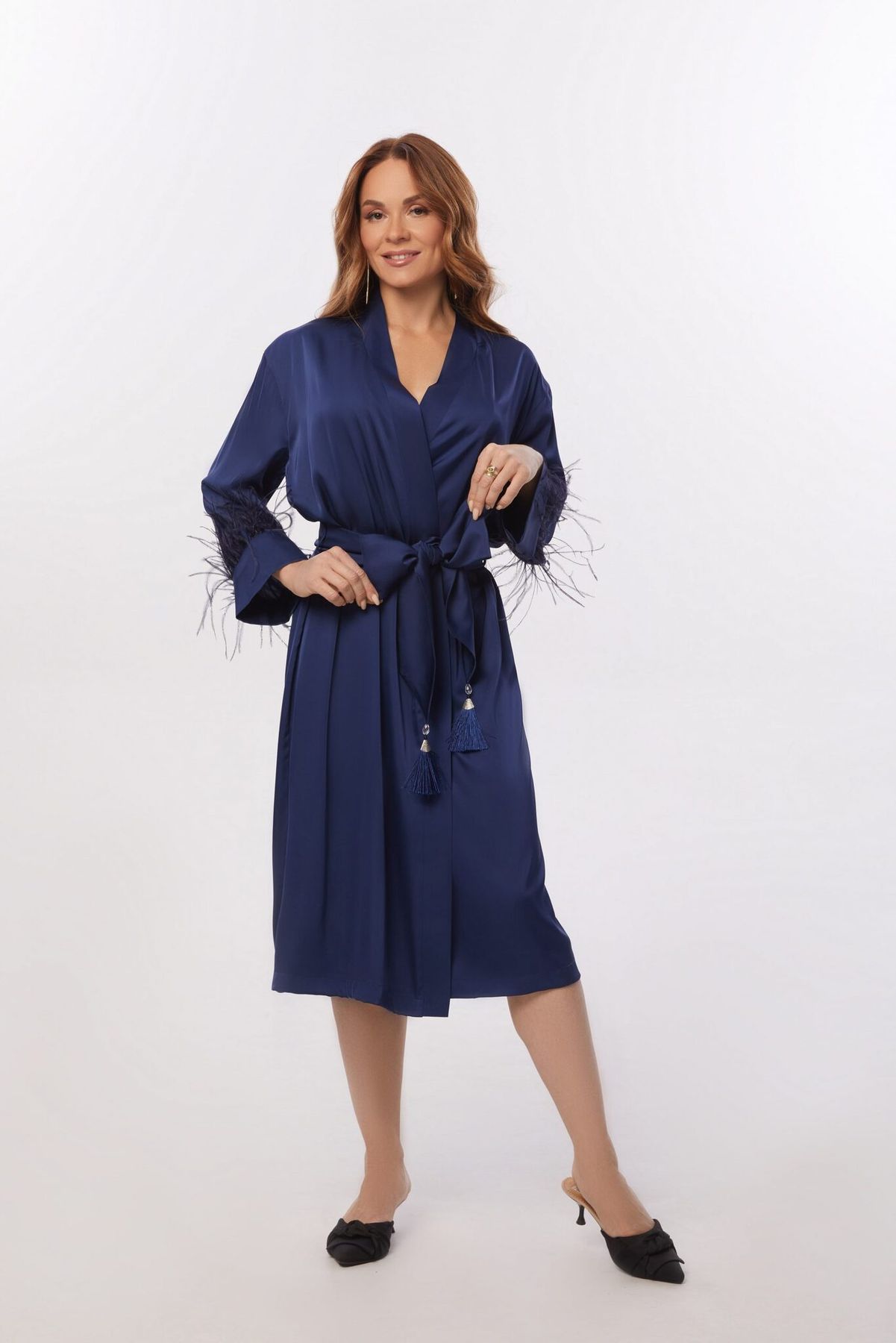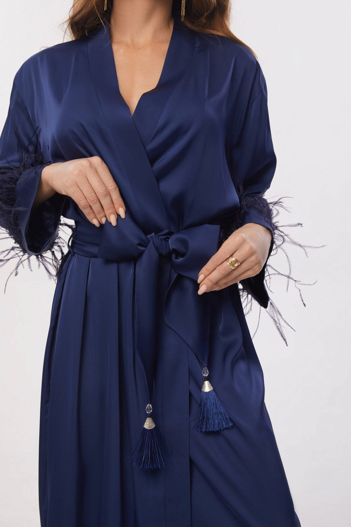 Шёлковый халат Matilda с отделкой из пера страуса создаёт выразительный образ — как дома, так и вне его. Благодаря плотной струящейся ткани и длине ниже колена, изделие трансформируется в платье-накидку, накидку поверх топа с брюками или вечерний образ в бельевом стиле.