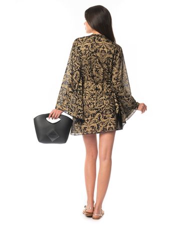 Короткое кимоно Couture aristocratic — эффектный акцент пляжного образа. Полупрозрачная ткань с золотым барочным узором создаёт ощущение лёгкости и визуальной глубины. Объёмные рукава и длина мини подчёркивают женственность и движение, а запах на пояс позволяет регулировать посадку и носить кимоно как платье.
