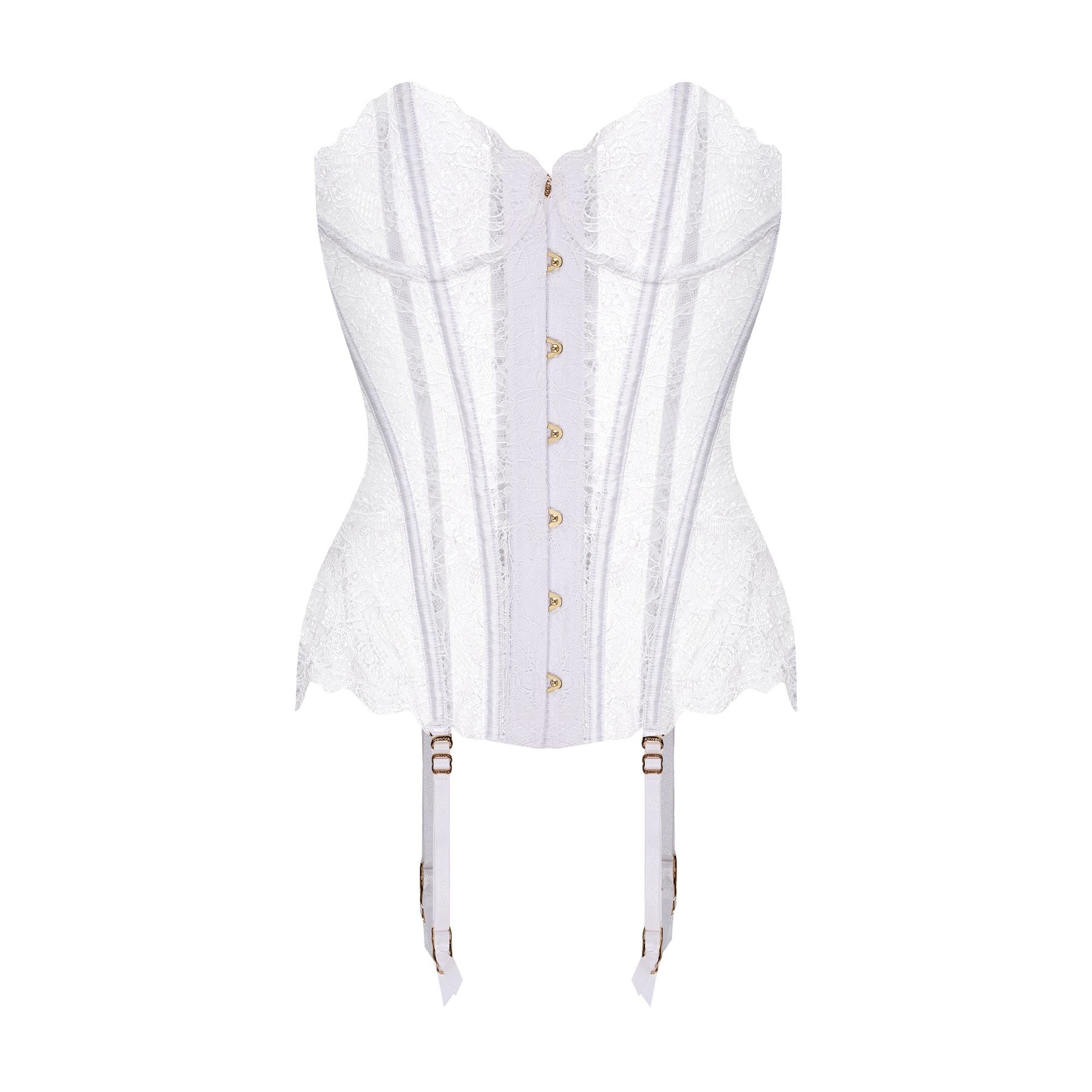 Длинные атласные ленты могут быть завязаны в роскошный бант или использоваться как пояс — дополнительный акцент в вечернем образе. Съёмные и регулируемые пажи позволяют носить корсет с чулками или без них, адаптируя стиль под настроение и случай.