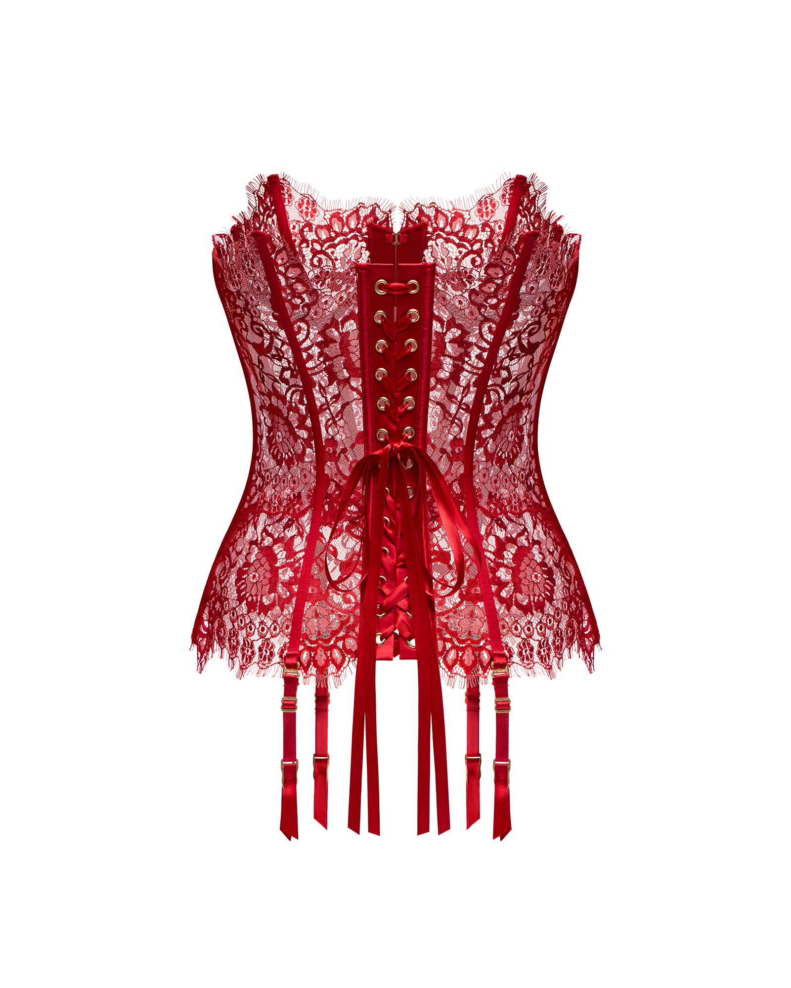 Корсет выполнен из французского кружева шантильи с выразительным ресничным краем. Плотный, объёмный и фактурный рисунок уверенно закрывает тело, сохраняя тонкую прозрачность и ощущение лёгкости. Кружево красиво работает в движении и подчёркивает архитектуру силуэта.