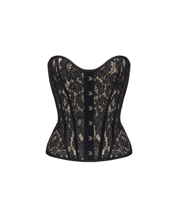 Корсет выполнен из кружева с выразительным цветочным орнаментом, разложенным на бежевой корсетной сетке. Такое сочетание создаёт эффект татуировки на коже — кружево словно растворяется в тоне тела, сохраняя графичность и глубину рисунка. Полуоткрытая чашка подчёркивает линию груди, а специально разработанная конструкция обеспечивает точную посадку и красиво адаптируется под разные формы.