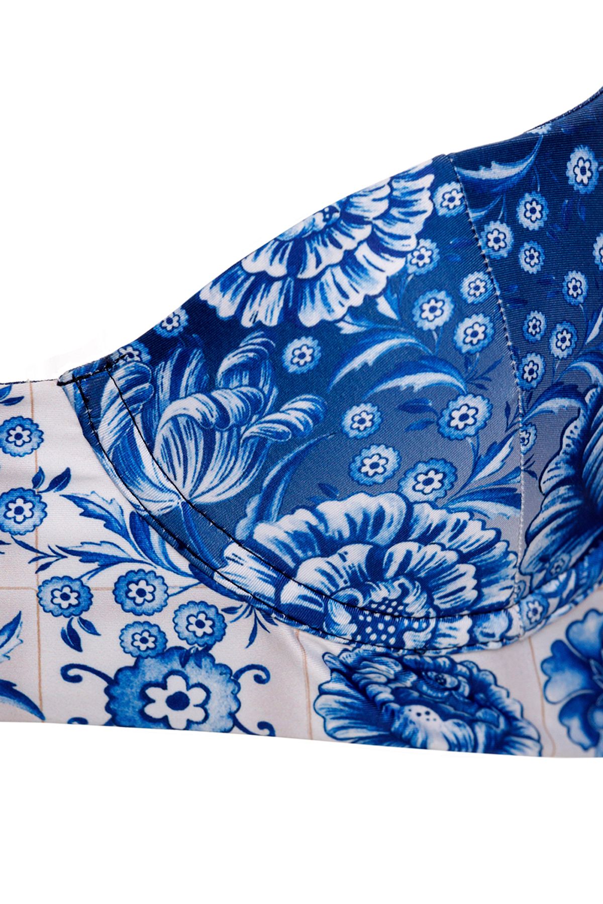 Лиф с косточками поддерживает грудь и формирует красивый силуэт, а металлическая застёжка сзади обеспечивает надёжную фиксацию и лёгкость в использовании. Дизайн с необычным синим орнаментом добавляет модели винтажное настроение и выделяет её среди других.