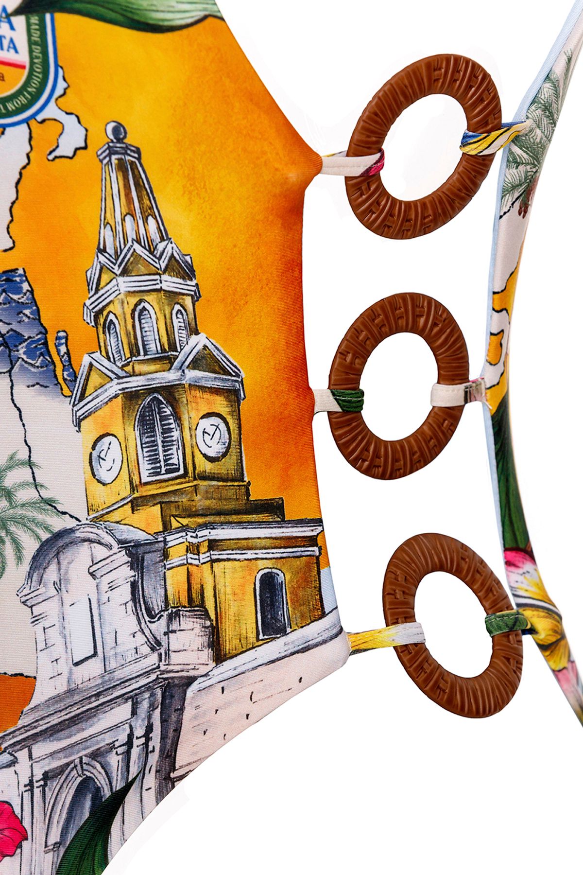 Боковые вырезы декорированы массивными кольцами, создавая изысканный акцент и подчёркивая динамику образа. Глубокий вырез на спине придаёт купальнику лёгкость и открывает новые грани женственности. Цветочный принт с винтажным вдохновением превращает модель в яркий акцент вашего пляжного гардероба.