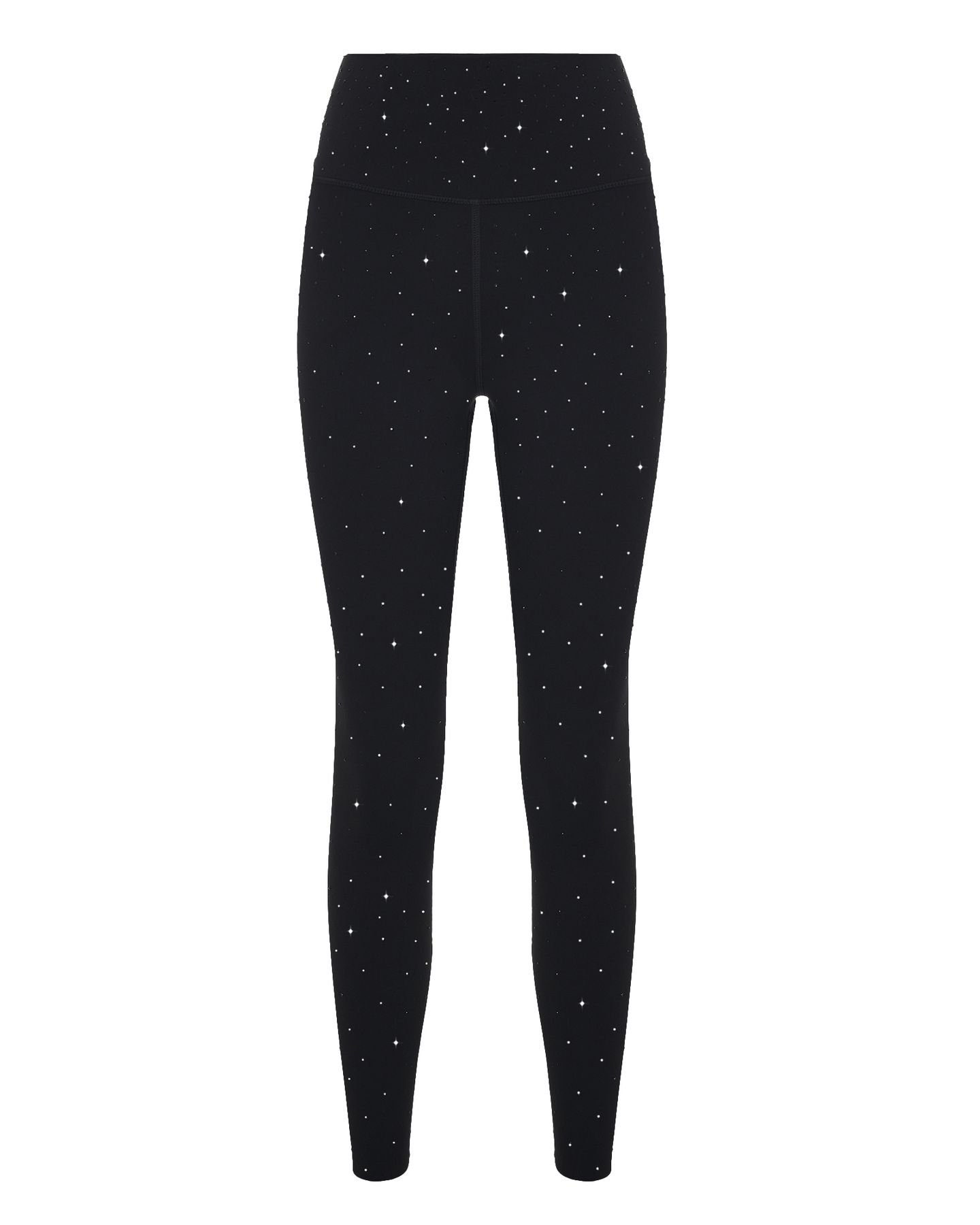 Леггинсы Aurora — как сияющий след от звезды: тянутся за движением, подчеркивают форму и притягивают взгляды. Высокая посадка с широким эластичным поясом моделирует талию и обеспечивает поддержку, а сотни миниатюрных страз рассыпаны по всей длине, создавая эффект северного сияния.