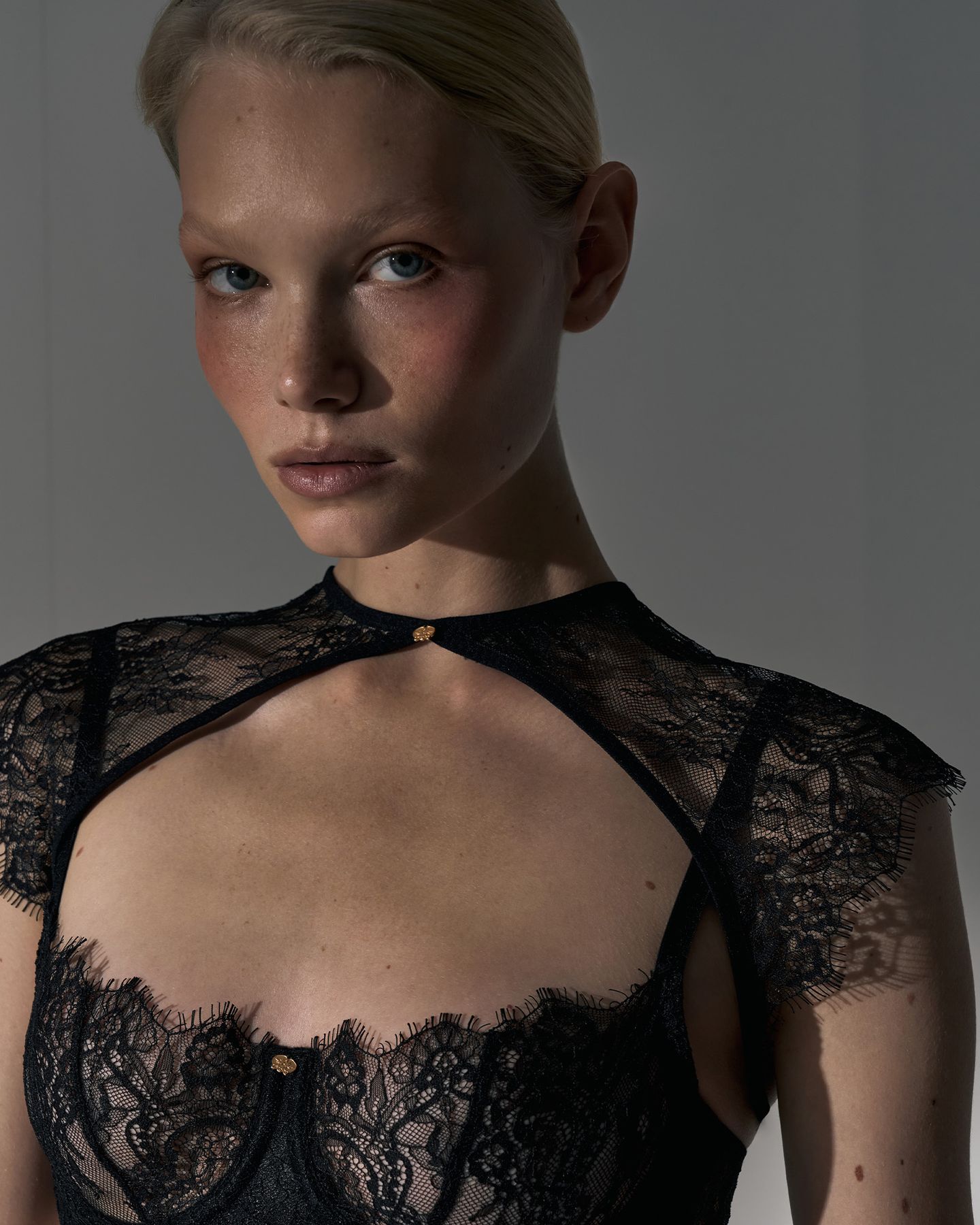 Ажурные края придают образу воздушность, а благородный оттенок кружева подчёркивает утончённость. Золотая орхидея — фирменный символ Scandale Manière — вручную пришита в центре выреза, завершая образ с характером.