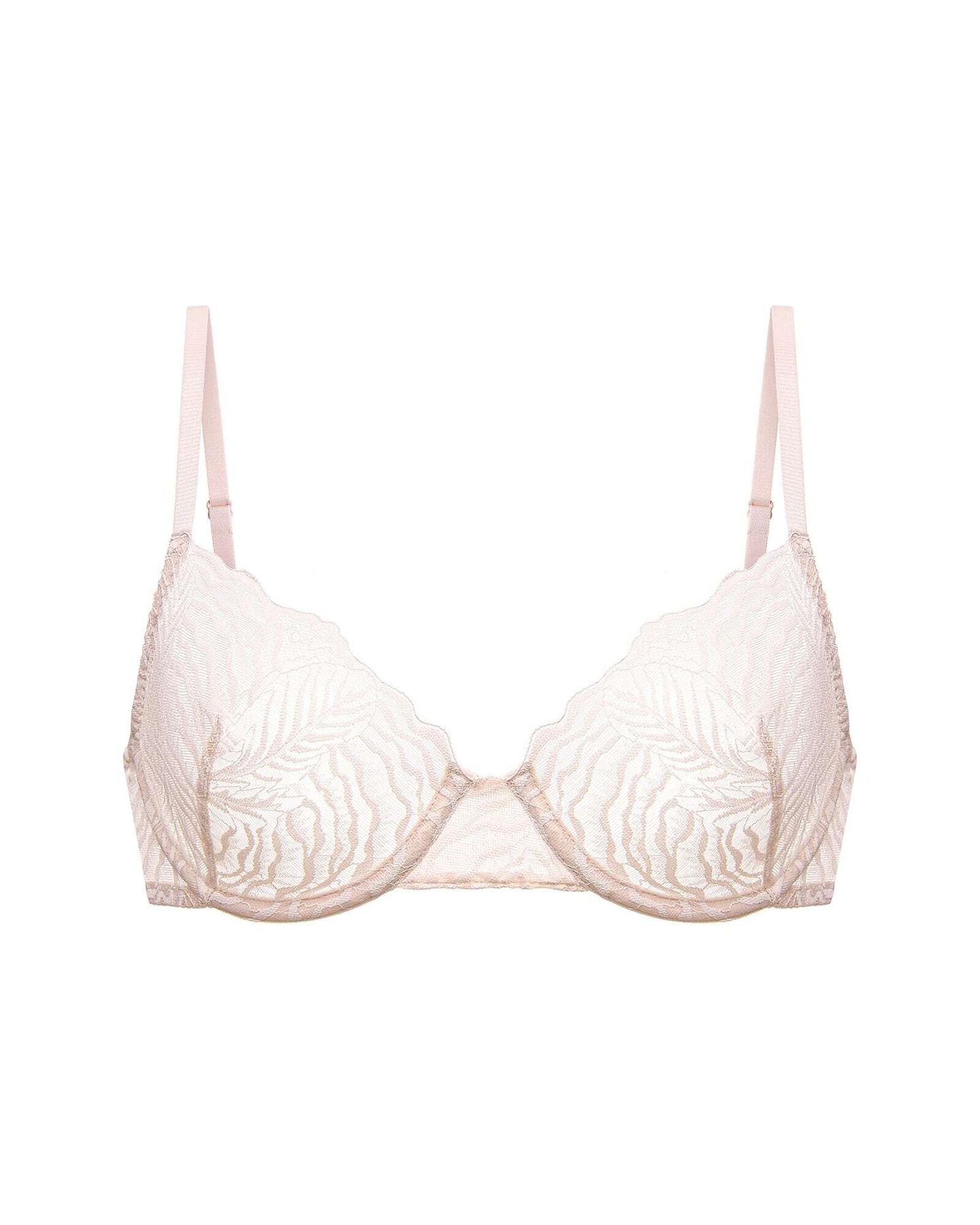 Мягкие чашки с наклонной вытачкой, начинающейся от боковой детали, формируют естественный объём и направляют грудь вверх и к центру. Средней глубины каркас усиливает поддержку, подчёркивая при этом глубокий V-образный вырез.