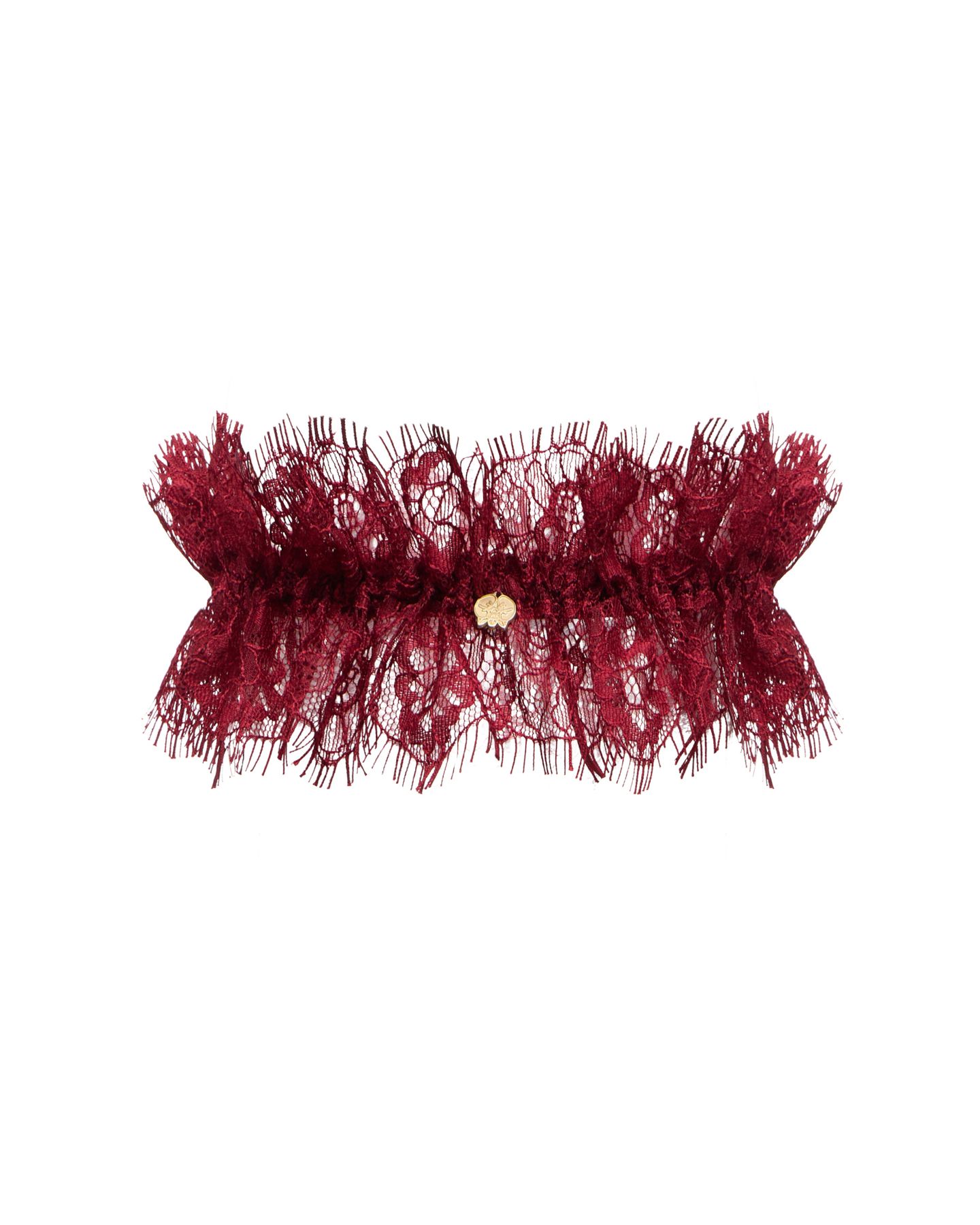 Подвязка из коллекции Scandale Manière — откровенный аксессуар, в котором эстетика становится игрой. Выполненная из роскошного кружева Шантильи, она изящно облегает ногу, собираясь в объемную, воздушную рюшу с фестончатым краем. Бордовый оттенок добавляет глубины образу и усиливает драматичный эффект.