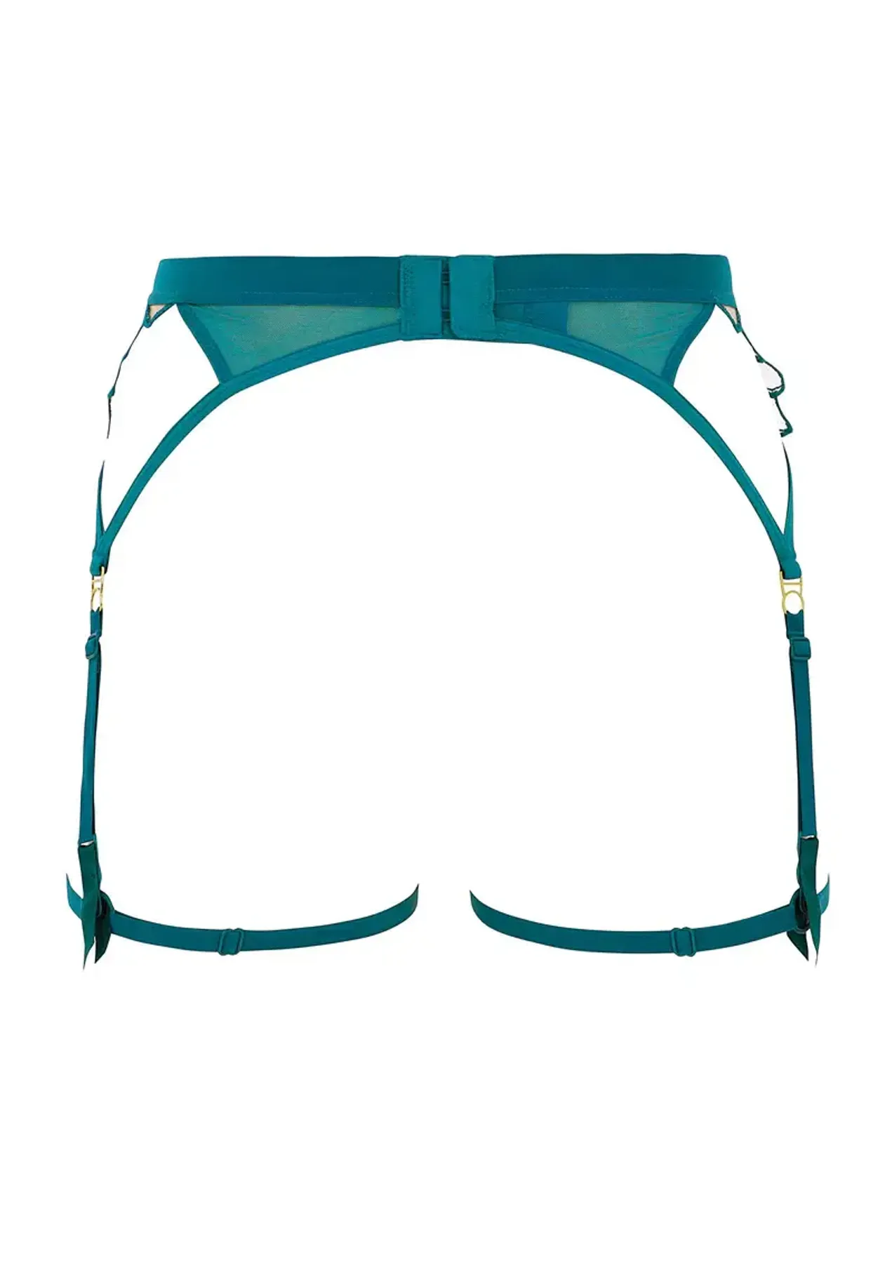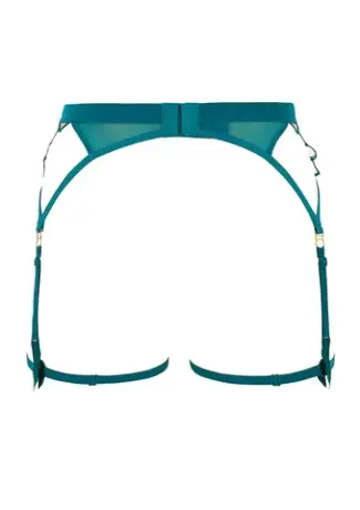 Пояс для чулок в изумрудном цвете из полупрозрачной сетки с графичной вышивкой подчёркивает талию и завершает образ. Регулируемые ремешки с золотистой фурнитурой обеспечивают удобную фиксацию чулок и создают эффектный комплект в сочетании с бюстгальтером и трусами из этой линии.