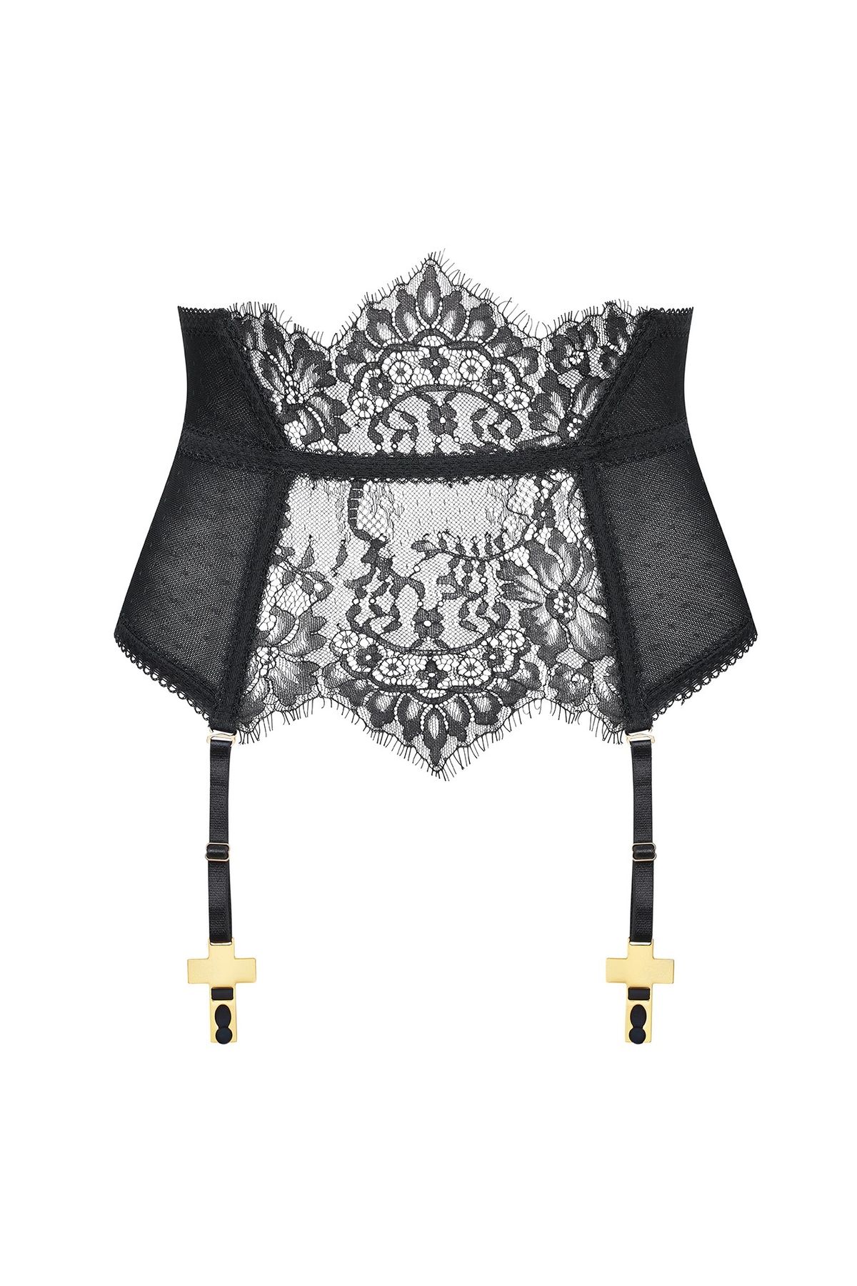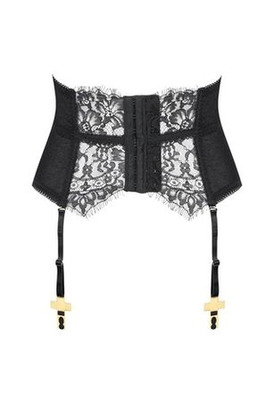 Пояс с подтяжками сочетает кружево в готическом стиле с эластичной сеткой с узором «швейцарская точка», дополненной боковой подкладкой. Конструкция подчёркивает талию и формирует силуэт за счёт мягких косточек и эластичных швов, сохраняя комфорт при ношении.