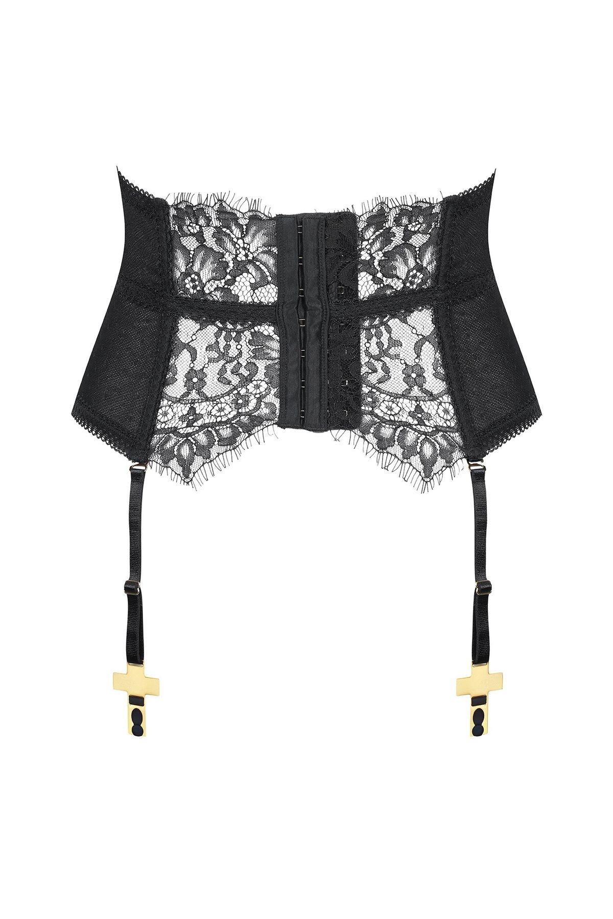 Модель оснащена регулируемой застёжкой на крючки сзади, обеспечивающей точную посадку. Пояс украшен четырьмя пажами для чулок с золотыми крестами — выразительным символом коллекции, в которой этот элемент стал культовым.