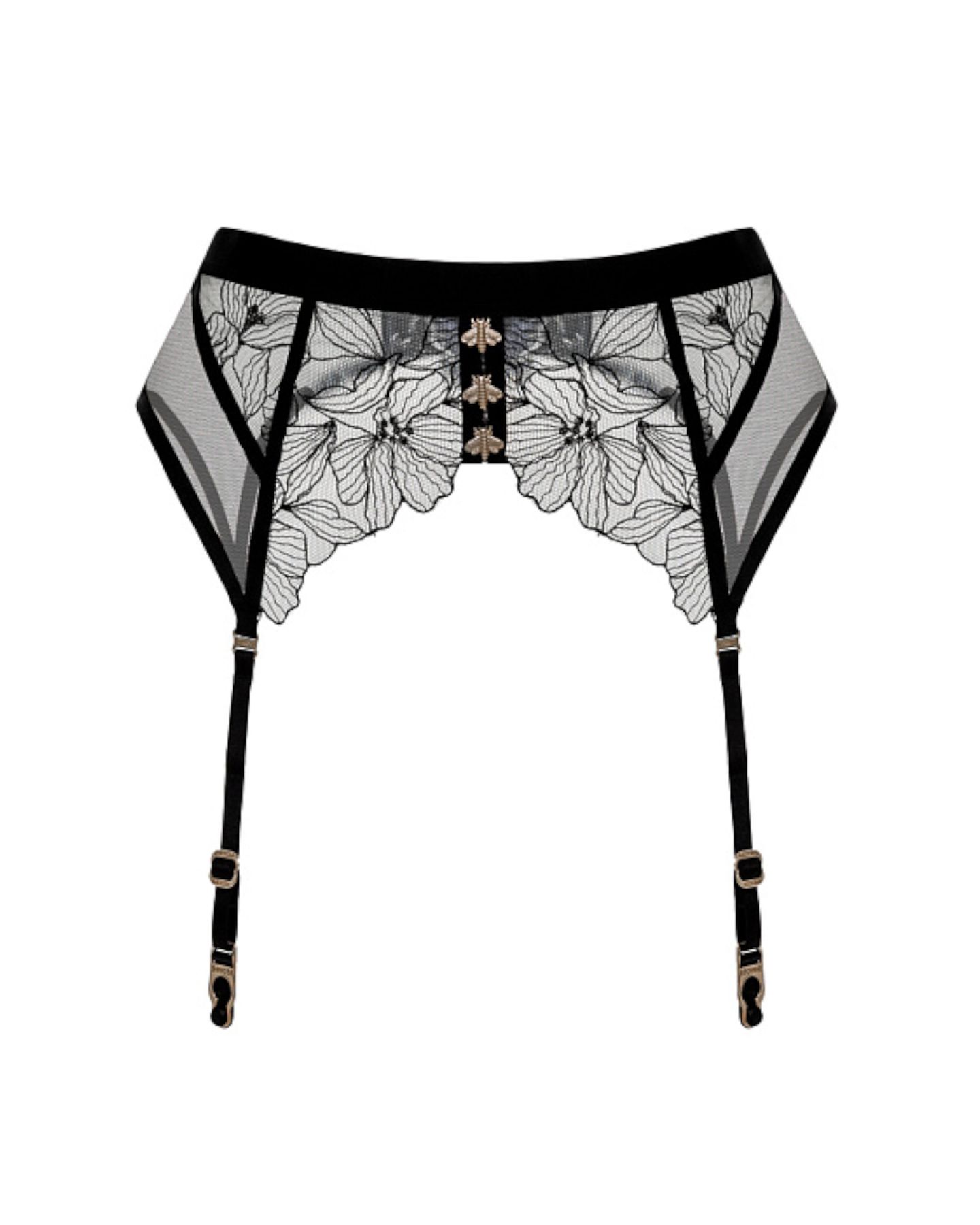 Пояс LIA — воплощение чувственной геометрии и ювелирной детализации. Модель объединяет эластичный тюль и вышивку с золотой нитью, создавая эффектный визуальный акцент и плотную, но мягкую посадку. Широкая линия талии подчёркивает фигуру и формирует чистый силуэт, а регулируемые стрепы надёжно фиксируют чулки.