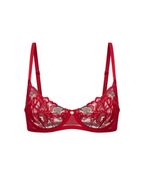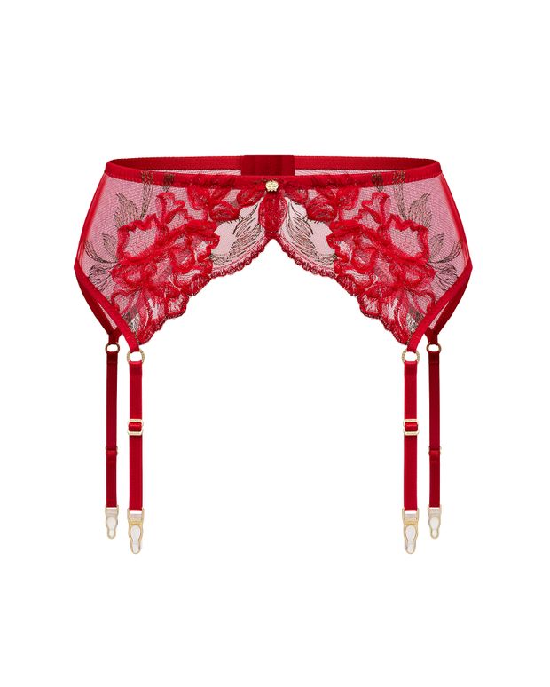 Пояс для чулок Passion — продолжение алхимии огня и кружева, где каждый элемент будто вырезан из пламени. Объёмные пионы цвета спелого граната, вышитые на эластичной сетке алого оттенка, создают эффект живого цветка, готового дрогнуть при движении. Лепестки выполнены из нитей кроваво-красного, гранатового и алого цветов, а листочки приподняты тонкой сетчатой лентой, формируя иллюзию рельефа и глубины. Геометрия силуэта с треугольными линиями подчёркивает талию и визуально вытягивает силуэт. Пояс становится не просто дополнением, а кульминацией композиции Passion — соблазнительной и графичной.