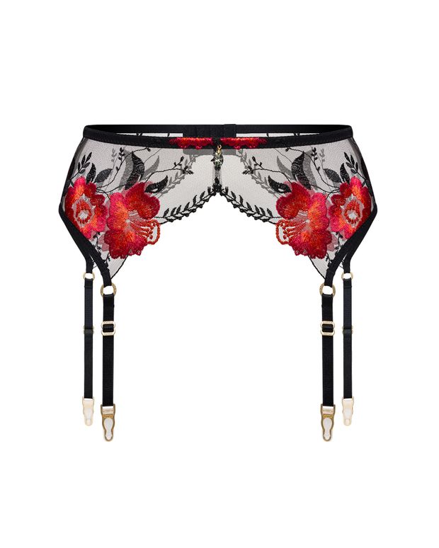 Пояс Phoenix Noir создан как центральный акцент коллекции, объединяющий в себе графичность конструкции и выразительность вышивки. Прозрачная чёрная сетка превращена в декоративное полотно, на котором алые амариллисы раскрываются как языки пламени. Треугольные элементы на линии талии формируют визуальную вертикаль и подчёркивают силуэт.